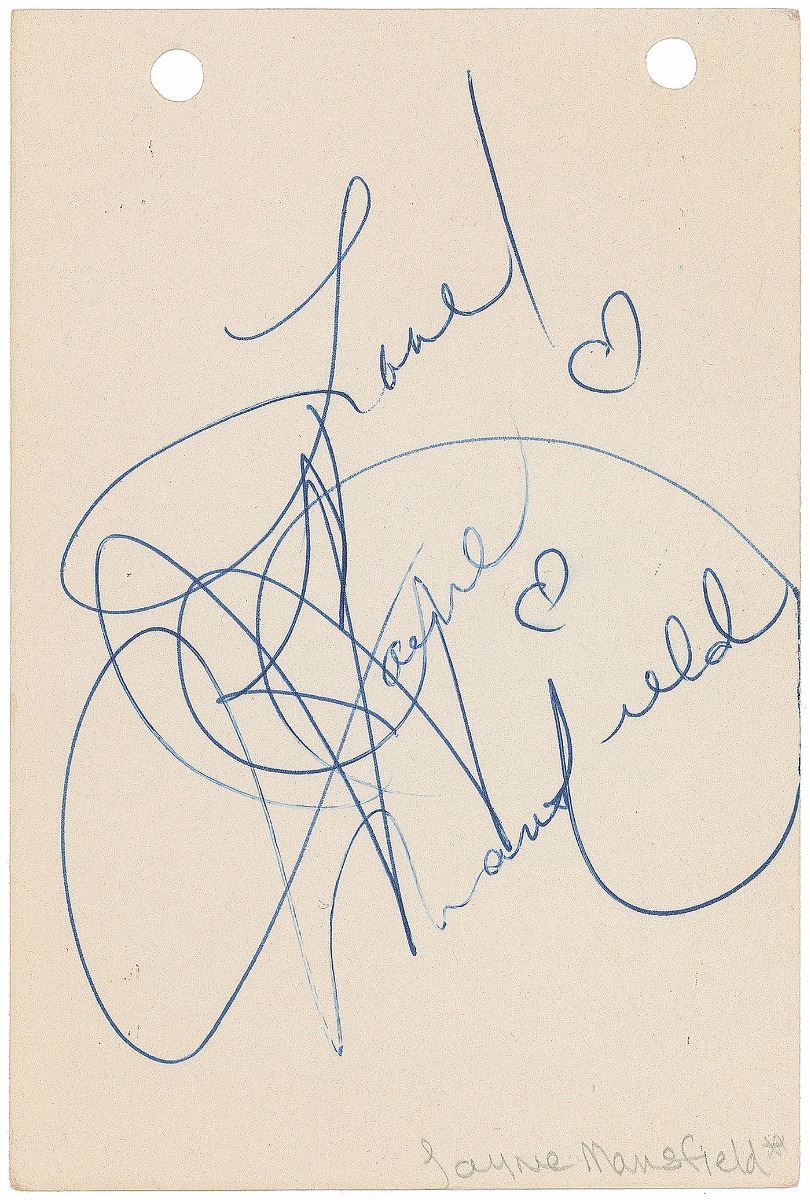 Ballpoint signature, “Love! Jayne Mansfield,” adding two small hearts on an off-white 4 x 6 card. In fine condition. Collector’s ink notations on reverse indicate that the signature was obtained at an art show in April of 1961.