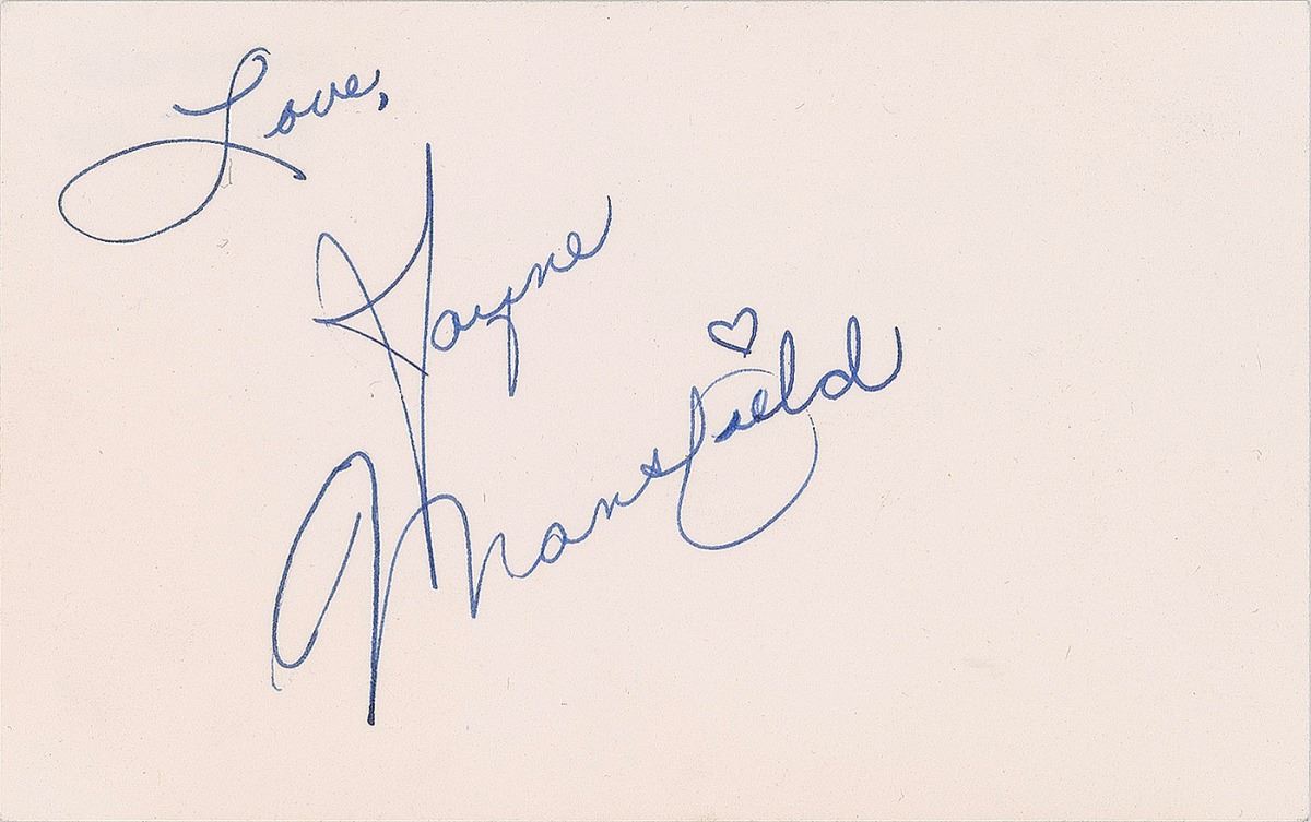 Desirable ink signature, "Love, Jayne Mansfield,” on an off-white 5.25 x 3.25 card. Reverse of card bears typed notations indicating date signature was obtained, "Apr. 26 1960." In fine condition.