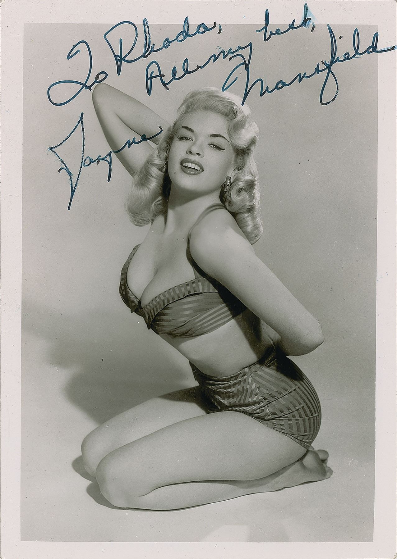 Vintage glossy 5 x 7 photo of the busty Mansfield in a revealing outfit, signed and inscribed in black ink, "To Rhoda, All my best, Jayne Mansfield.” In fine condition, with a bit of brushing to signature. From the Harvey and Rhoda Kuflik Collection.