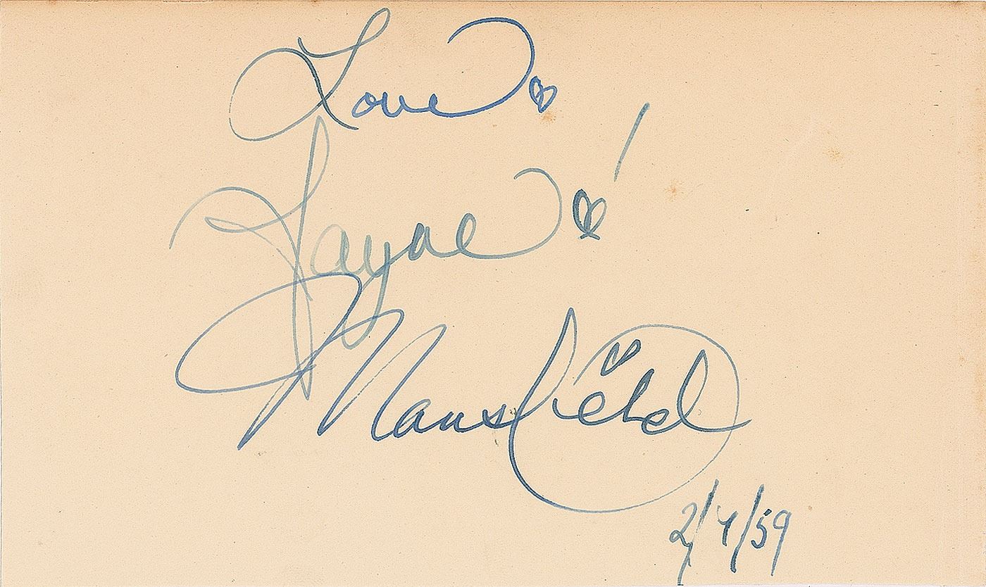 Vintage fountain pen signature, "Love, Jayne Mansfield, 2/4/59," on an off-white 6 x 3.5 album page. In fine condition, with a bit of light creasing.