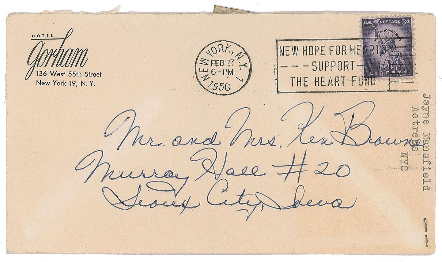 Two letters: an ALS, one page, 6 x 9.5, Hotel Gorham letterhead, postmarked February 27, 1956, addressed to Ken Browne, in part: "I've been awaiting some pictures of Jayne Marie and me to arrive so I could send one to you.They were taken at the Stork Club, and I think very much along the lines of what you have in mind for over your desk," with Mansfield adding a postscript: "The pictures will be sent to you in a few days"; and a TLS, one page, 6 x 9.5, Hotel Gorham letterhead, April 16, 1956, forwarding two pictures to Browne as promised, with Mansfield signing "Jayne" to a postscript: "I as yet have not received the picture of Jayne Marie and me at the Stork Club. If you would like it, please write to the Stork Club." In overall very good to fine condition, with chipping an tears to the edges, and a block of toning to the handwritten letter. Accompanied by the original mailing envelope for the handwritten letter.