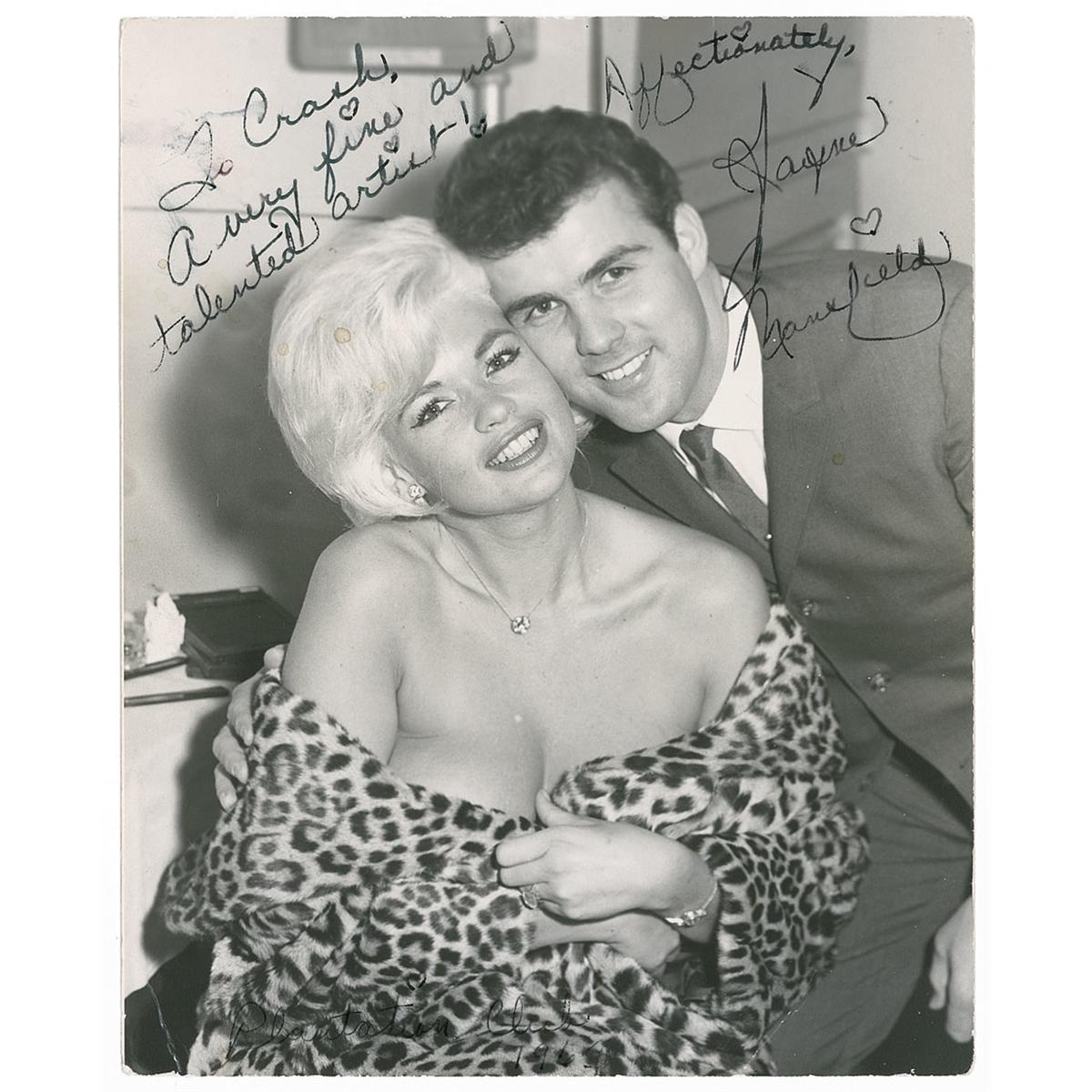 Vintage original matte-finish 8 x 10 photo of Mansfield spilling out of her leopard-print wrap and posing with country music star Billy Crash Craddock, signed and inscribed in fountain pen “To Crash, A very fine and talented artist! Affectionately, Jayne Mansfield.” Written along the bottom in an unknown hand is the location of the “Plantation Club 1963.” In very good condition, with several brushes to inscription, several light creases, a couple light spots to Mansfield’s hair, and some scattered light edge wear. This photo was taken by Mansfield’s personal photographer at the Plantation Club, and is stamped on the back, “Hope Powell Studio, Salisbury, N.C.” Intended to make its way to Craddock as a keepsake, it instead remained with the photographer all these years. A unique piece from one of Hollywood’s greatest starlets.