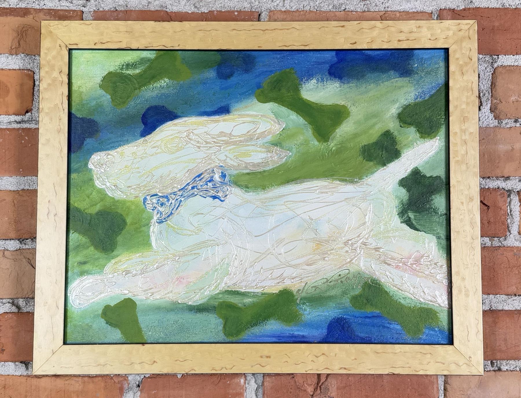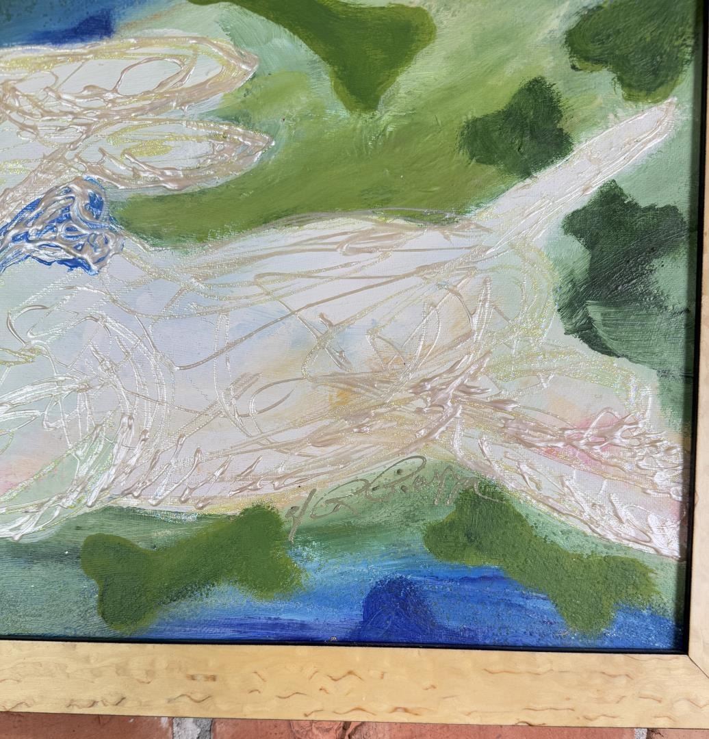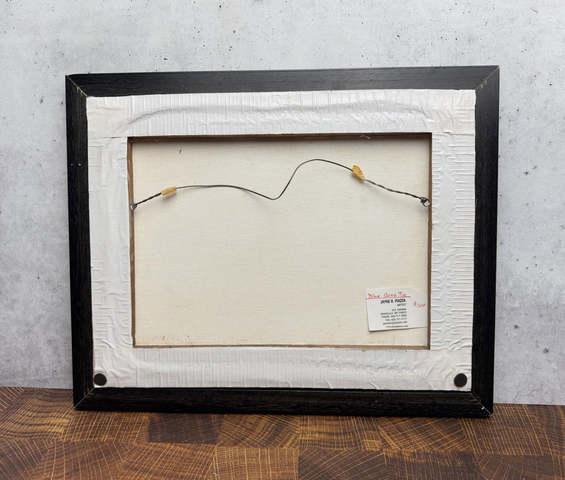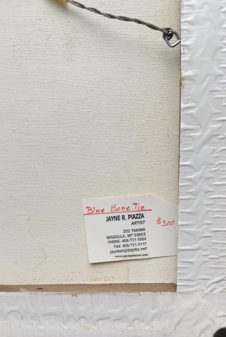 16 1/4" by 20 1/4" framed. Title is Blue Bone Tie An award winning artist, Jayne has been exhibiting professionally for over thirty years. A graduate of the University Of Montana, she continued to study art while living in Chicago and traveling the world. She's kayaked, hiked, biked, dove and snorkeled while in Iceland, the South Pacific, the South of France, South America, Europe, the Kingdom of Tonga, the arctic and well beyond. And she brought the light and excitement of these distant worlds to her home in Montana. These amazing twists of a life well lived and traveled permeate Jayne’s work. At home in her Montana studio, working solo, or literally, with thousands of children, Jayne has an impressive resume of completed private and public art works. Her work has been featured in magazines, on CD covers, reality TV, in numerous one-person shows and exhibits across the country and is found in several private and corporate collections. Current work may be seen in Missoula at The Indulgent Gallery at Front Street Capital Management, The Art Hang-Up Gallery, Bird In Hand in Bigfork Montana, & The Resort at Paw's Up in Greenough Montana.