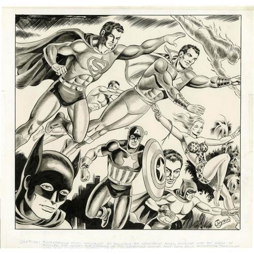 <B>Jayson Disbrow - Golden Age Superheroes Illustration Original Art (undated). </B></I> Batman, Superman, Sub-Mariner, Captain Marvel, the Human Torch, Captain America, the Spectre, and Sheena -- this Jayson Disbrow pin up spotlights a "who's who" of the Golden Age. As Disbrow wrote in a caption at the bottom of this star-studded sensation, "They sprang from hundreds of millions of newsprint pages, straight into the heart of America. The heroes and heroines of the adventure comics have long since ingratiated themselves into the cultural pattern of this nation." This power-packed piece has an image area of 11.25" x 10.75", and the art is in Excellent condition.<BR><BR><b>Shipping:</b> Framed - with Glass, Small (<a target="_blank" href="http://www.heritageauctions.com/common/shipping.php">view shipping information</a>)