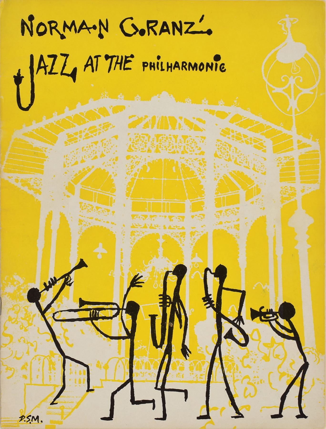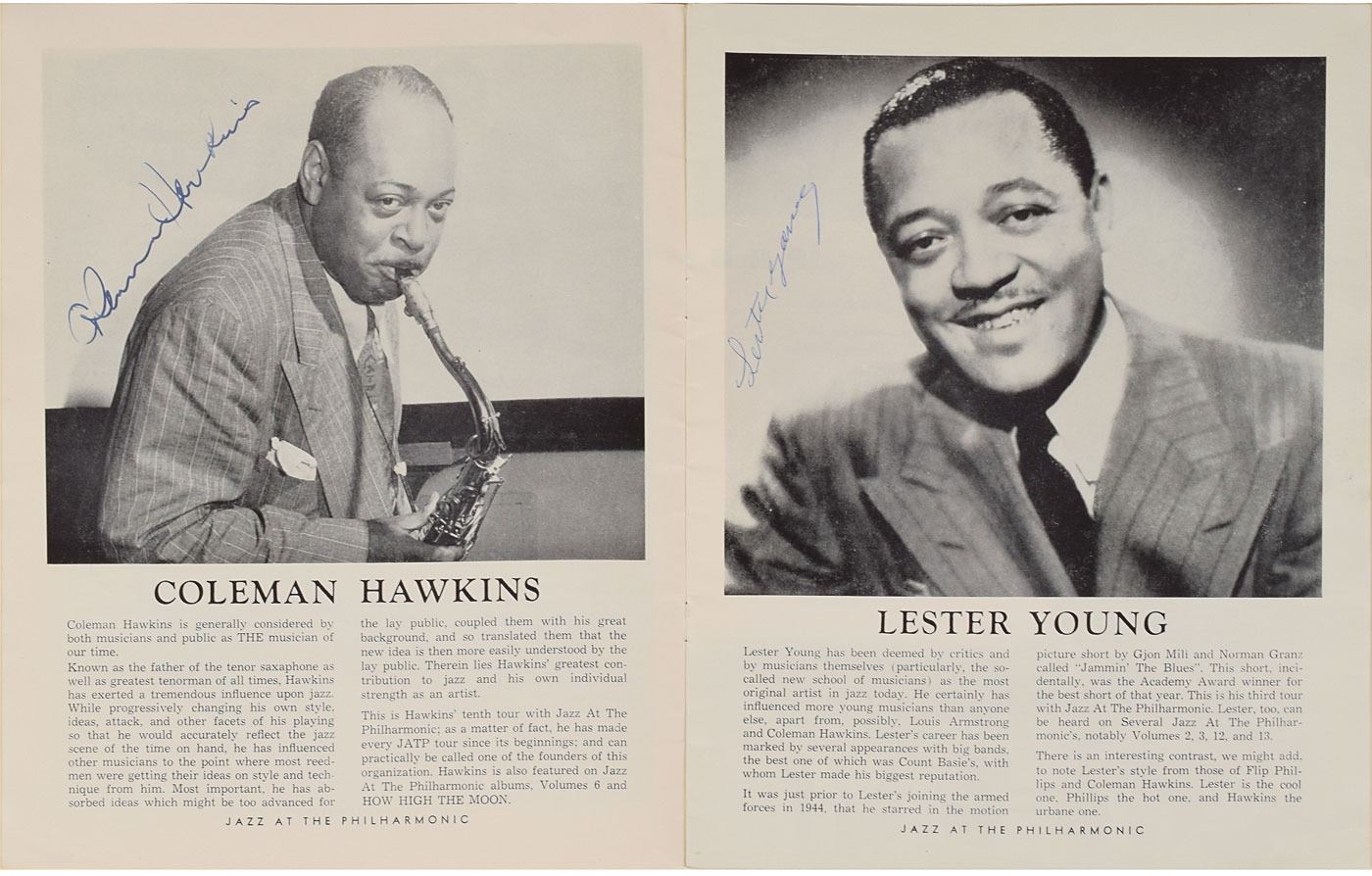 Program for Norman Granz' Jazz at the Philharmonic, 1951, 8.5 x 11, signed inside in ink by seven jazz greats: Flip Phillips, Buddy Rich, Coleman Hawkins, Lester Young, Oscar Peterson, Harry Edison, and Hank Jones. In fine condition, with light handling wear.