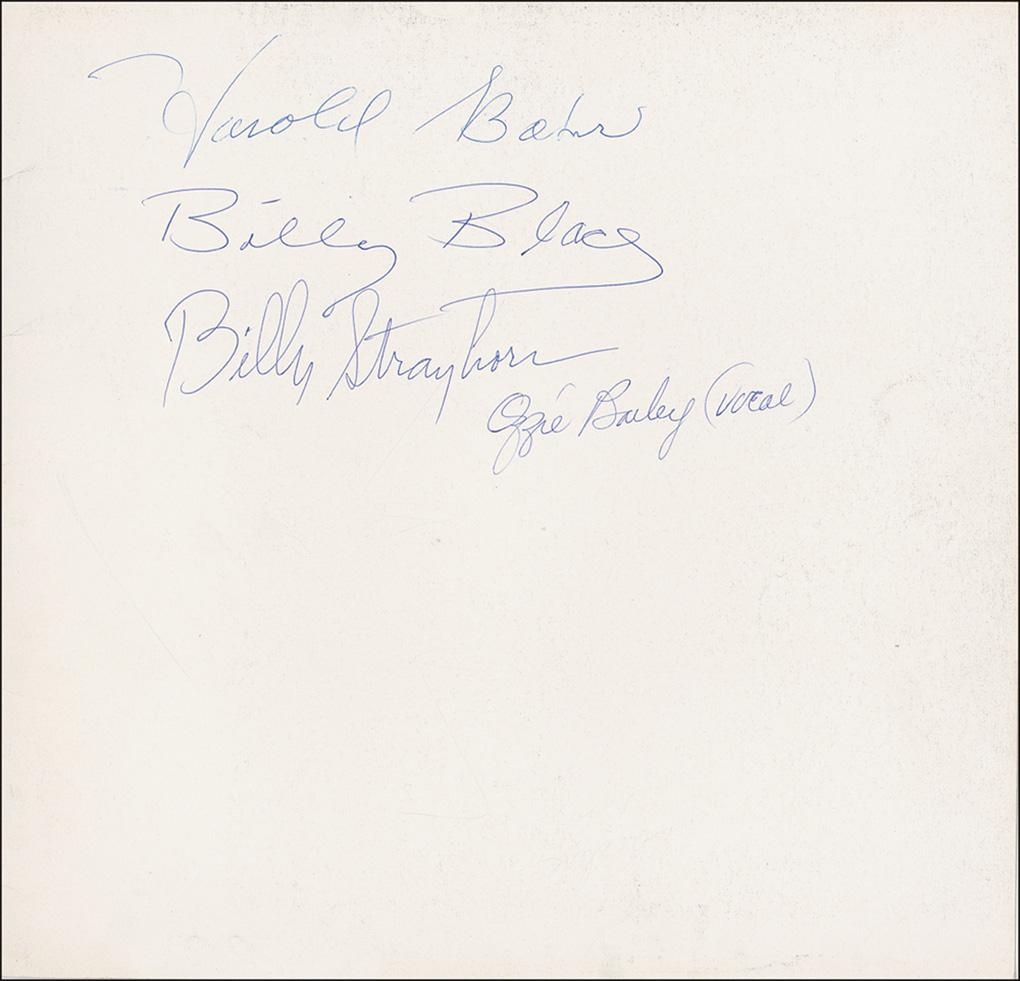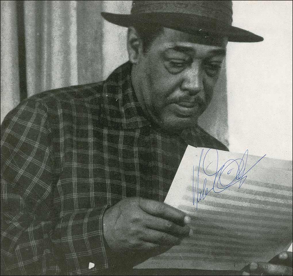 Two Jazz programs: Norman Granz’ Jazz at the Philharmonic, 10.75 x 14, signed inside on their full page photos by Big Joe Turner, Max Bennett, Ray Brown (on affixed slip), Roy Eldridge, Herb Ellis, Stan Getz, Dizzy Gillespie, Coleman Hawkins, Pete Johnson, and Sonny Stitt; and a Duke Ellington program, 10.75 x 10, signed inside by Duke Ellington, also signed on an inside page by Duke Ellington Orchestra members John Sanders, Clark Terry, Paul Gonsalves, Johnny Hodges, Russel Procope, Harry Carney, Britt Woodman and Jimmy Hamilton. Ozzie Bailey (vocal) on the inside back cover. and on the inside back cover by Harold Baker, Billy Strayhorn, and Ozzie Bailey. In very good condition, with detached covers to both, and most pages of both programs detached from spine.
