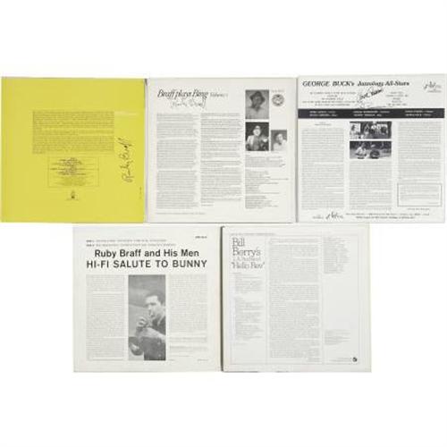 <B>Group of Signed Jazz LPs And Photos, Including Ruby Braff, George Buck and Bill Berry.</B></I> Each album includes a signed 8 X 10 photo. Includes Ruby Braff's <I>Braff Plays Bing: Swinging On A Star</B></I> signed by him with a photo signed by Braff, Johnny Mince and George Dominic, the <I>Hi-Fi Salute To Bunny (Berigan)</B></I> signed by Braff with an 8 X 10" signed by him, <I>Ruby Braff Plays Louis Armstrong</B></I> signed by Braff with an 8 X 10" signed by him, George Buck's <I>Jazzology All Stars</B></I> signed by Ernie Carson and Charlie Bornemann with an 8 X10" signed by Buck, and Bill Berry's <I>Hello Rev</B></I> with an 8 X 10" signed by Berry.<BR><BR><b>Shipping:</b> Recordings (<a target="_blank" href="http://www.heritageauctions.com/common/shipping.php">view shipping information</a>)