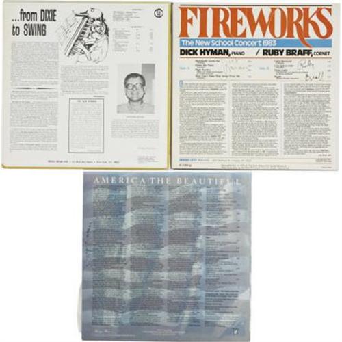 <B>Group Of 3 Signed Jazz LPs And 3 signed Photos Including Ruby Braff, Dick Hyman, Dick Wellstood.</B></I> Each signed by some or all of the album's players. Includes <I>From Dixie To Swing</B></I> signed by Kenny Davern, Doc Cheatham, Vic Dickenson, Gus Johnson Jr., Dick Wellstood and George Divivier, both <I>Fireworks</B></I> and <I>America The Beautiful</B></I> signed by Ruby Braff and Dick Hyman, as well as one picture signed by both Braff and Hyman and one picture of each player alone, signed.<BR><BR><b>Shipping:</b> Recordings (<a target="_blank" href="http://www.heritageauctions.com/common/shipping.php">view shipping information</a>)