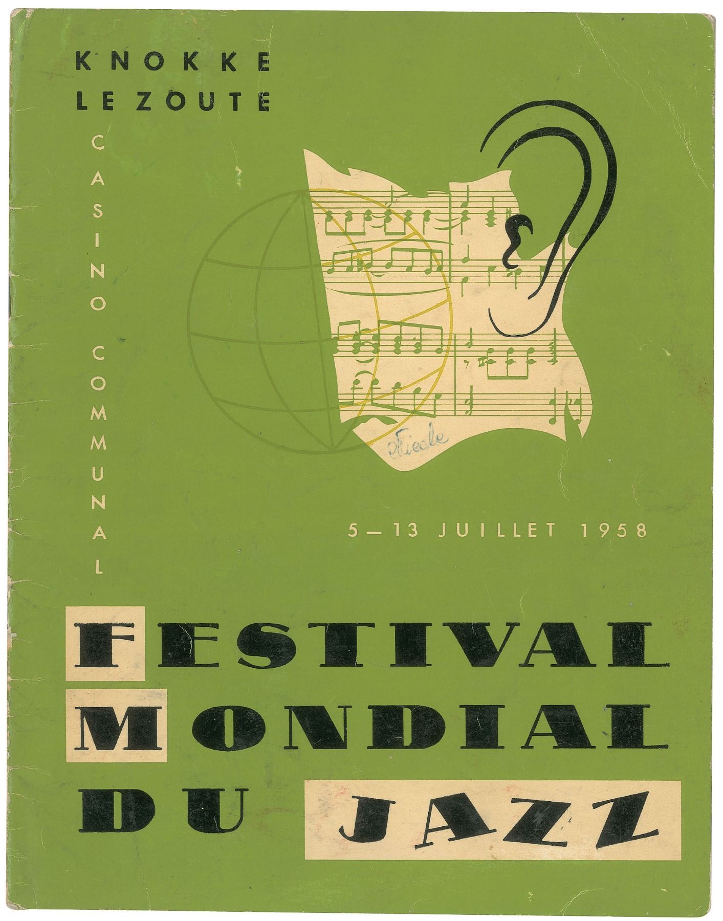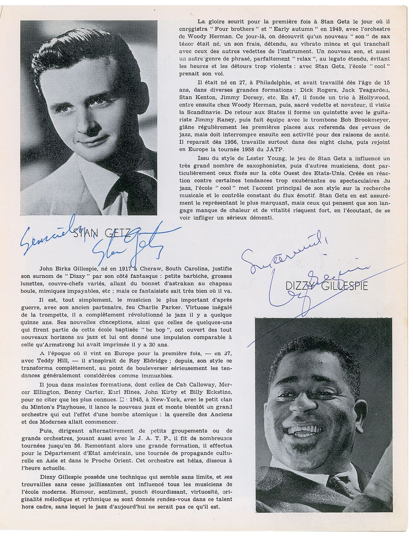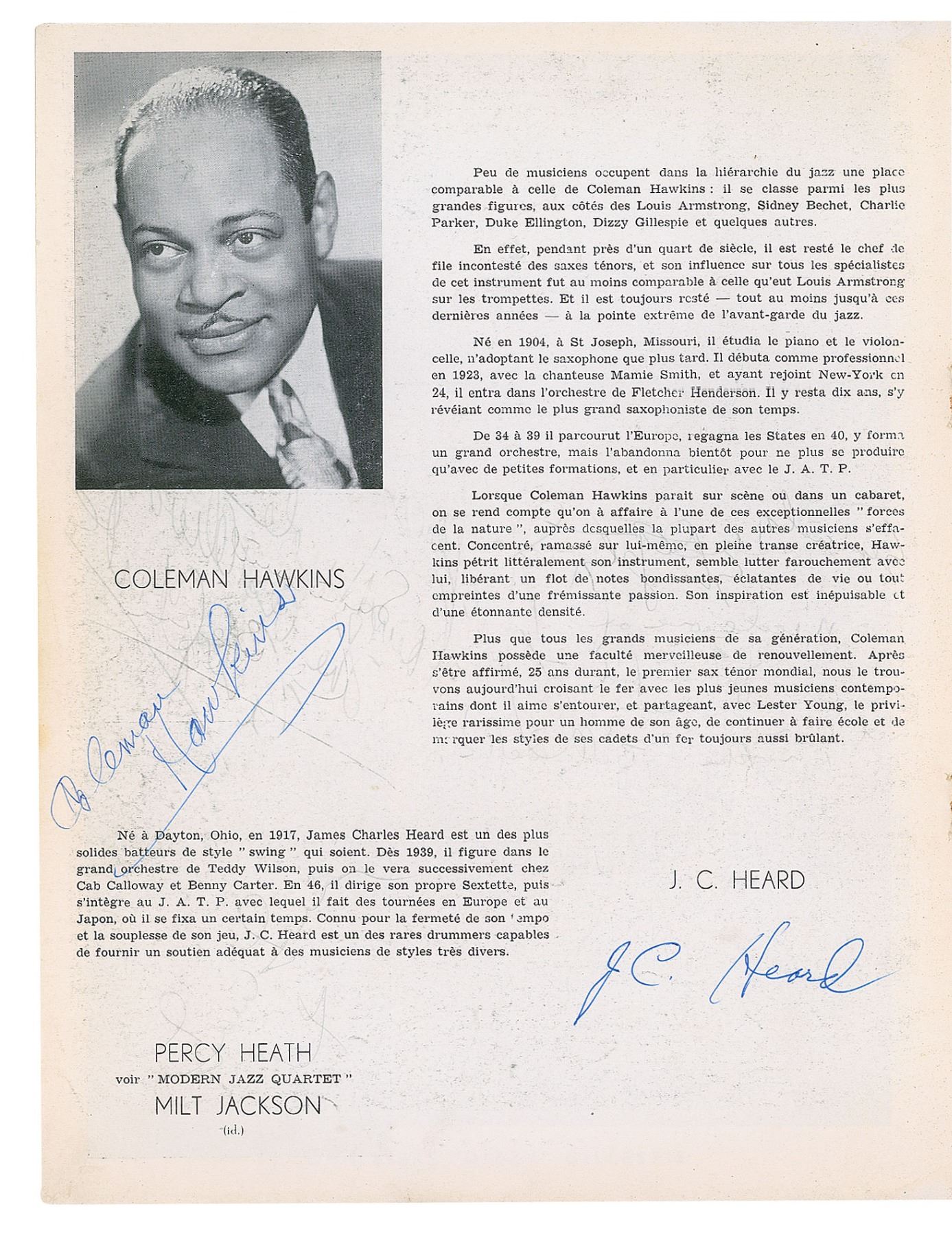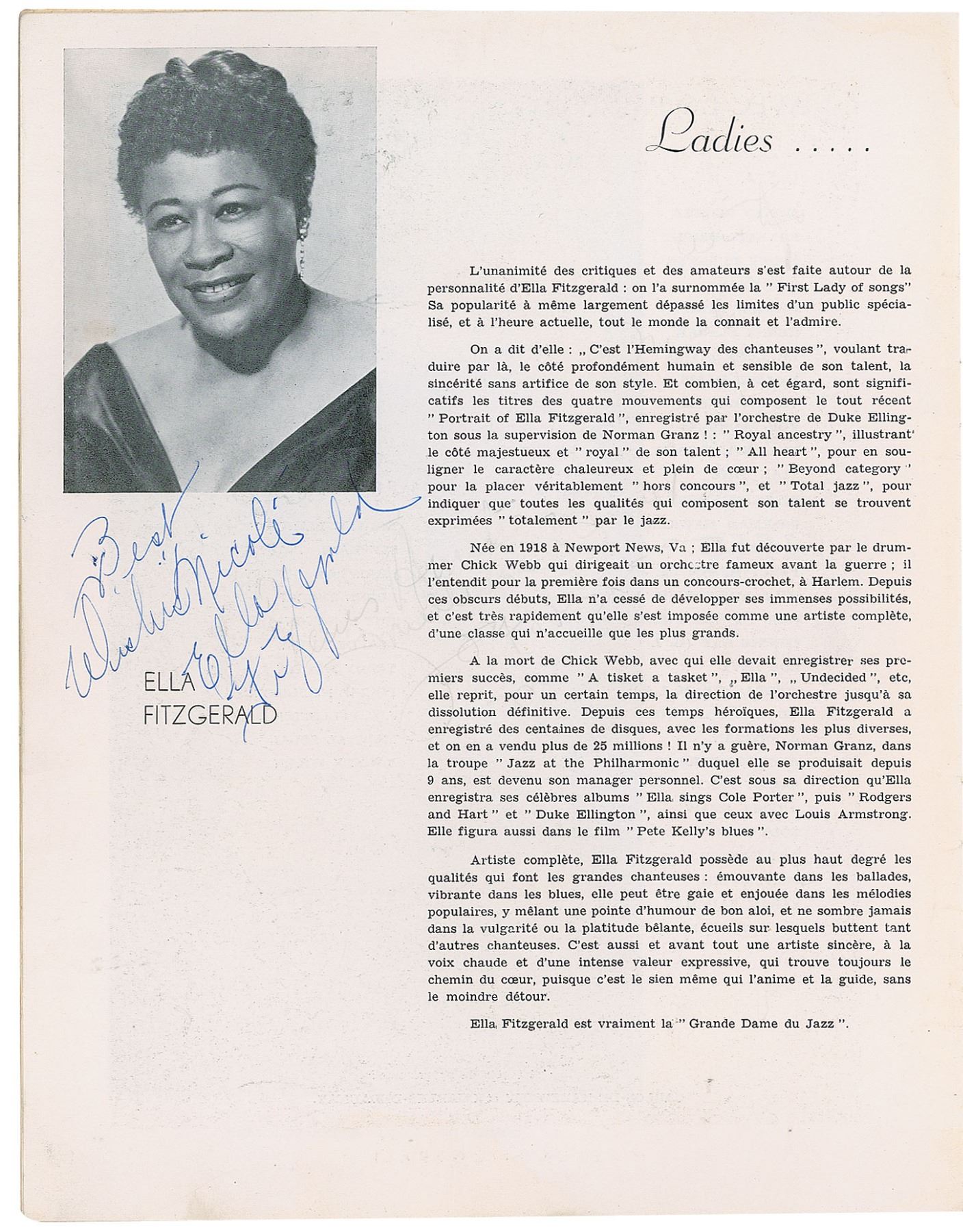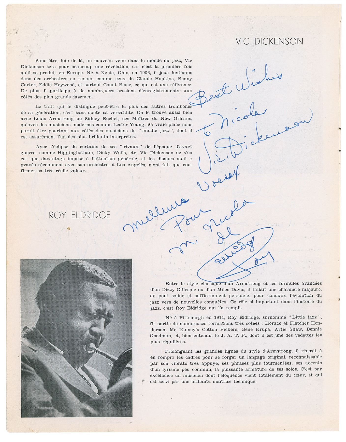 Vintage program for the Festival Mondial du Jazz held at Belgium's Knokke Casino in collaboration with the Hot Club de Belgique and Jazz Hot, with shows running from July 5-13, 1958, 32 pages, 8.25 x 10.5, signed inside in ink and ballpoint by several of the performers, with several inscribed to "Nicole," including: Ella Fitzgerald, Roy Eldridge, Dizzy Gillespie, Coleman Hawkins, Stan Getz, Sarah Vaughan, Sidney Bechet, Teddy Buckner, Don Byas, Donald Byrd, Kenny Clarke, Vic Dickenson, J. C. Heard, Lou Levy, the Modern Jazz Quartet (Connie Kay, Milt Jackson, and Percy Heath), Sammy Price, Arvell Shaw, and Doug Watkins. In very good condition, with creasing and moderate overall handling wear.