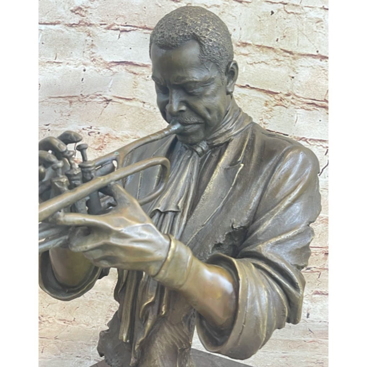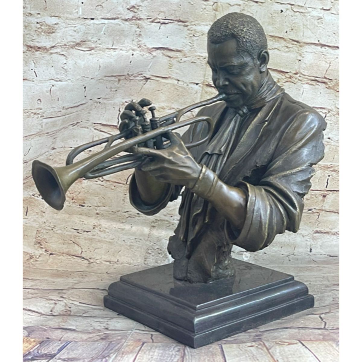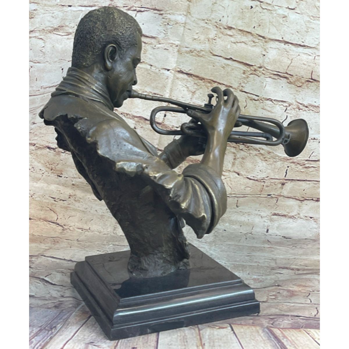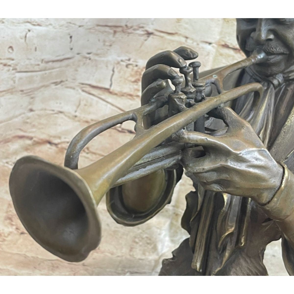 Jazz Musician playing a trumpet original signed sculpture. Lost wax casting method bronze, with brown patina, mounted on a marble base. Signed by the artist, Dwight, at base. 14 1/2" H X 14" W. 21lbs.Â