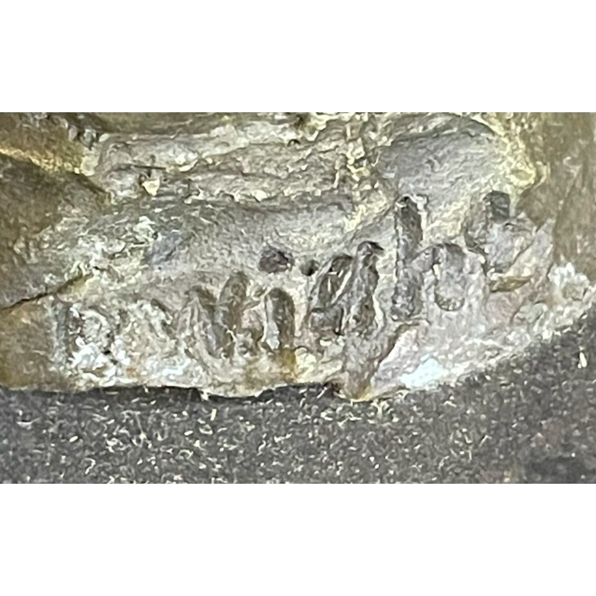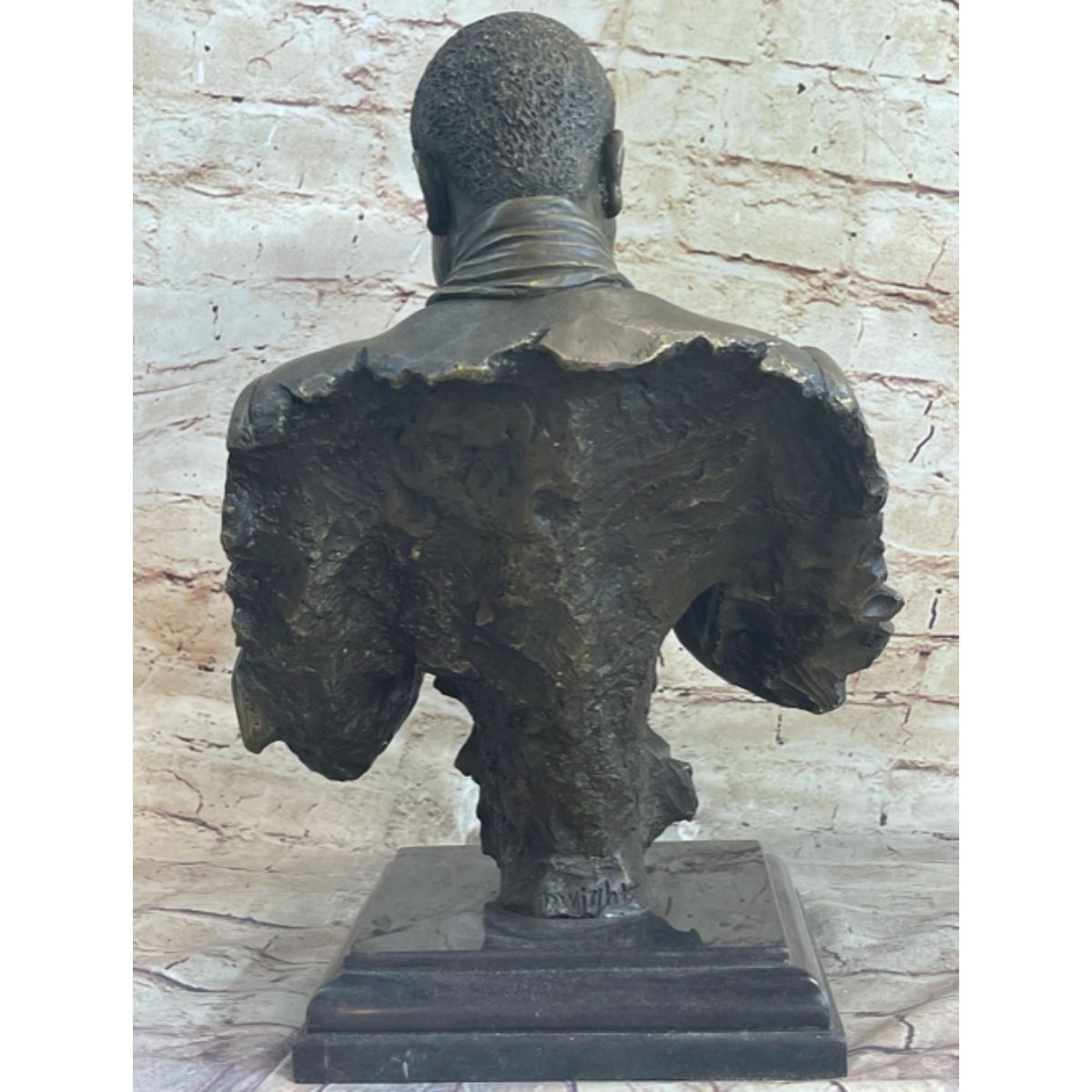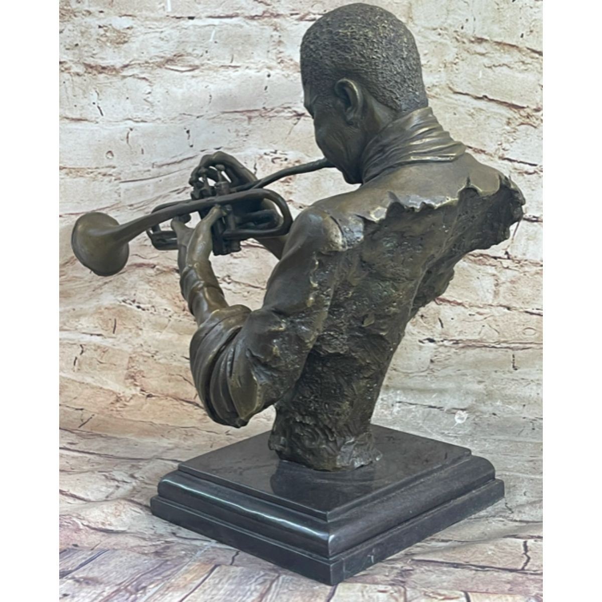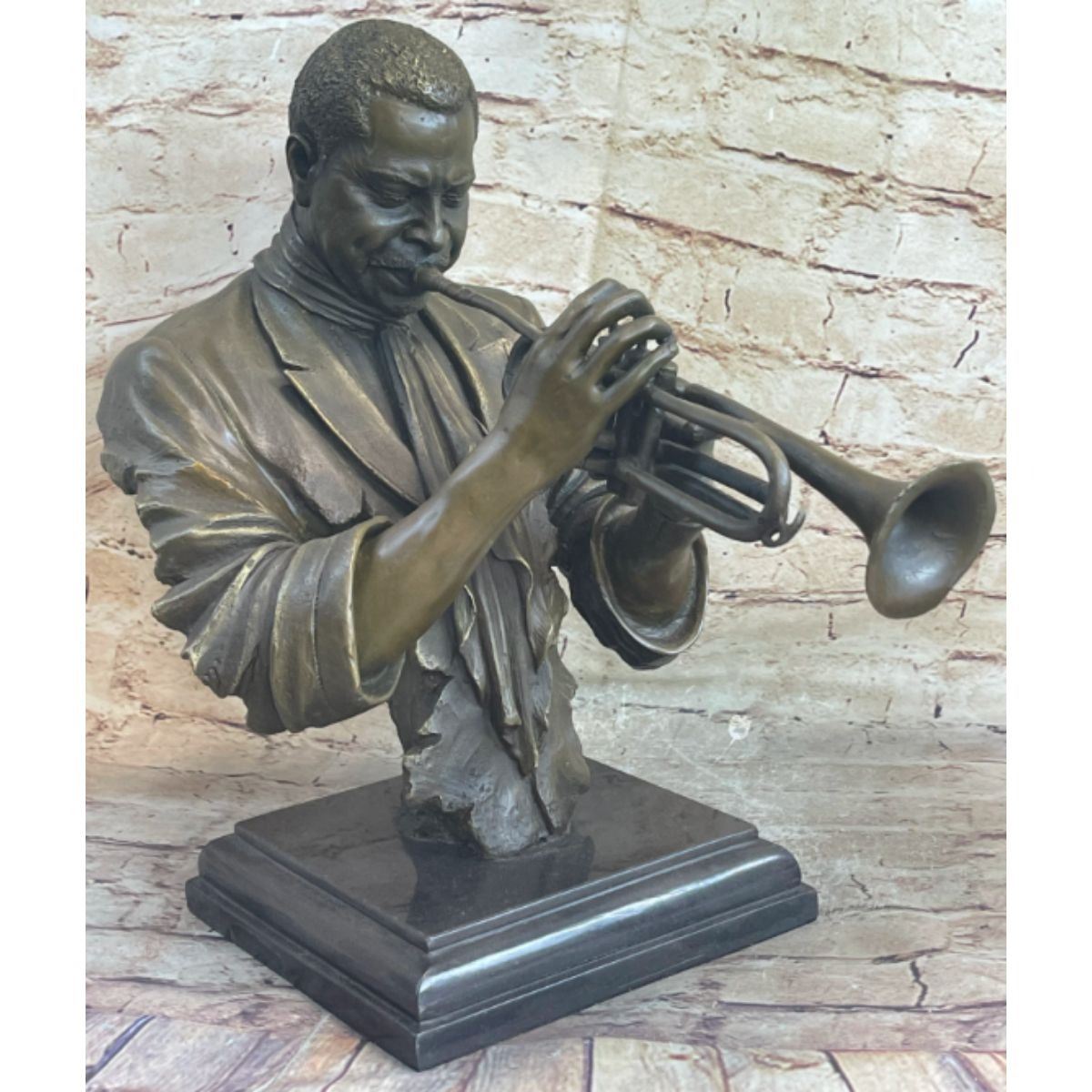 Jazz Musician playing a trumpet original signed sculpture. Lost wax casting method bronze, with brown patina, mounted on a marble base. Signed by the artist, Dwight, at base. 14 1/2" H X 14" W. 21lbs.Â