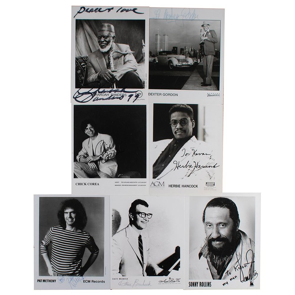 Seven 8 x 10 photos of notable jazz musicians, each signed by the pictured player (some inscribed): Dave Brubeck, Chick Corea, Dexter Gordon, Herbie Hancock, Pat Methany, Sonny Rollins, and Pharoah Sanders. In overall fine condition, with binder dings to the Gordon photo.