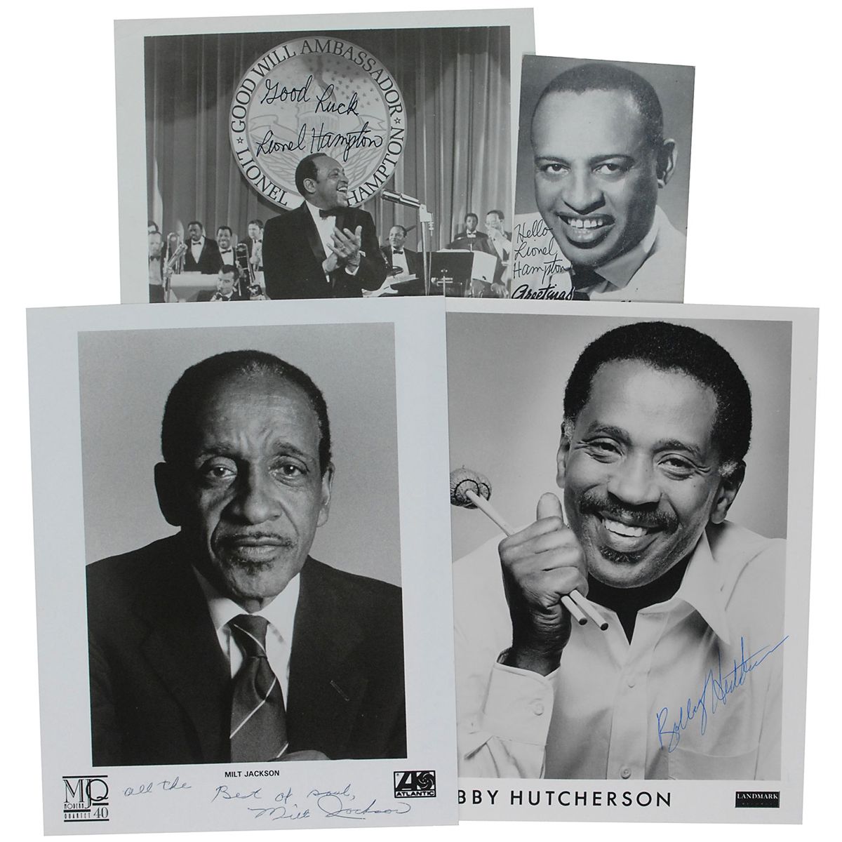 Four photos of acclaimed vibraphonists: glossy 8 x 10 photo of Lionel Hampton, signed in black felt tip; cardstock 3.25 x 5.25 photo of Hampton, signed in black felt tip; glossy 8 x 10 publicity photo of Milt Jackson, signed in the lower border in black ballpoint; and a glossy 8 x 10 publicity photo of Bobby Hutcherson, signed in blue ballpoint. In overall fine condition, with some creasing to the cardstock photo.