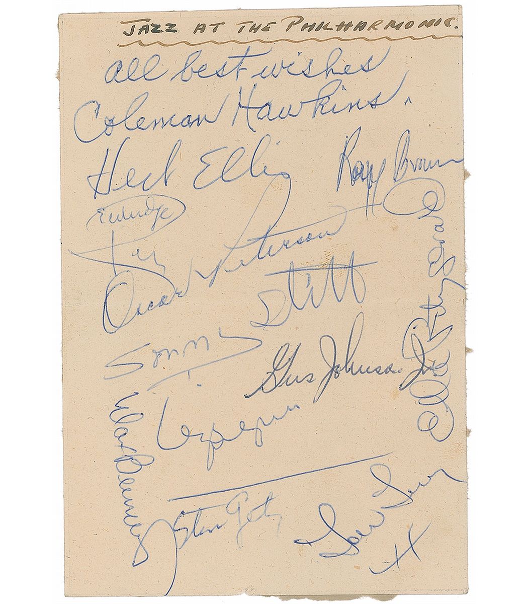 Vintage ballpoint signatures of 12 jazz greats on an off-white 4 x 6 album page, including: Ella Fitzgerald, Dizzy Gillespie, Coleman Hawkins, Stan Getz, Oscar Peterson, Roy Eldridge, Sonny Stitt, Herb Ellis, Gus Johnson, Ray Brown, Max Bennett, and Lou Levy. In fine condition, with a central horizontal fold and mild soiling. Accompanied by the original handbill for the Norman Granz’ Jazz at the Philharmonic show where these autographs were acquired, held at Gaumont State Cinema in Kilburn, London, on May 18, 1958; this came during the first UK tour of Granz’ famous concert series.