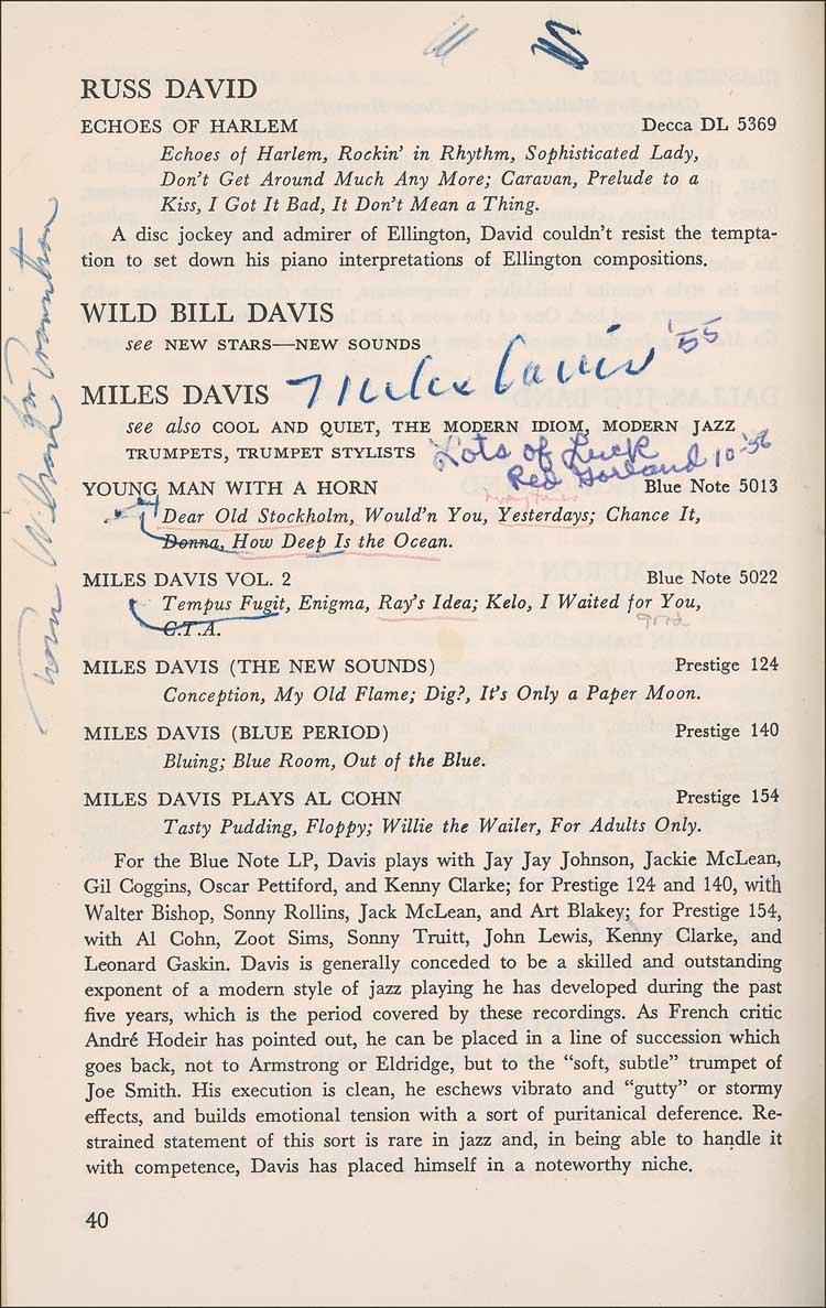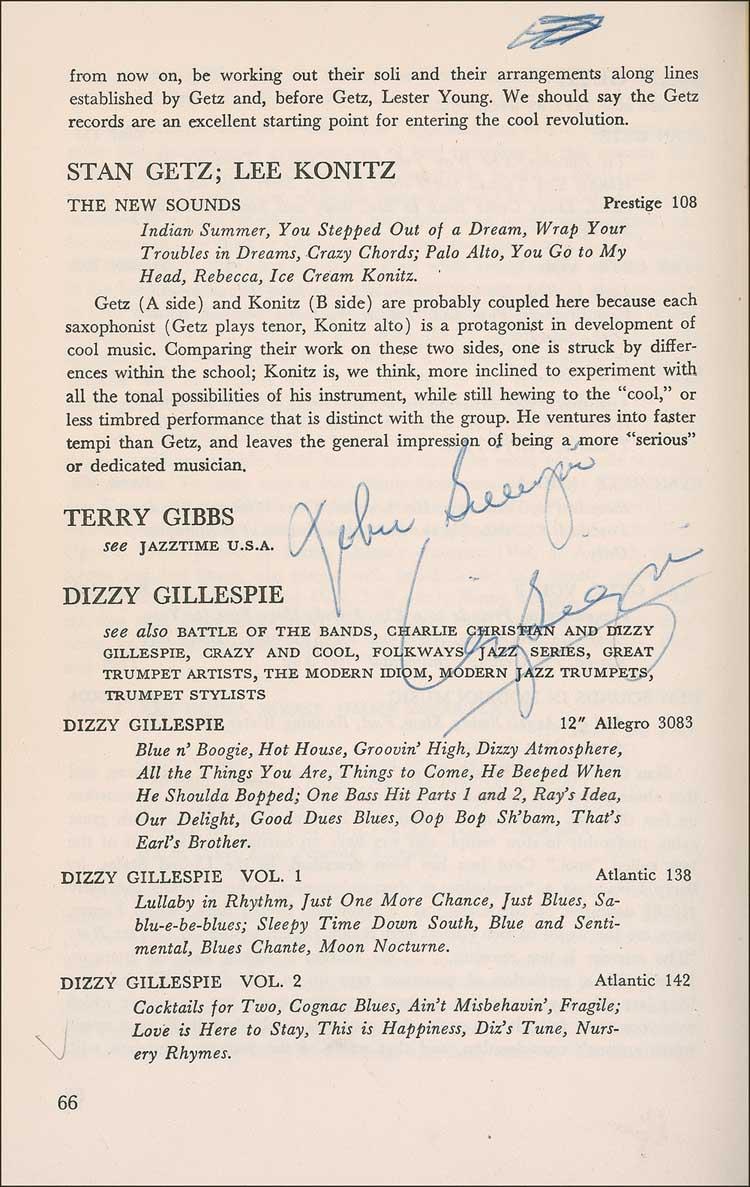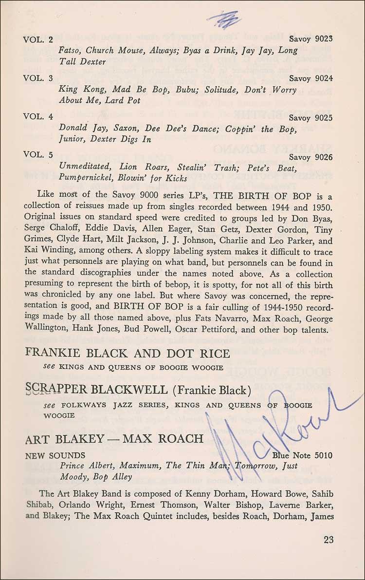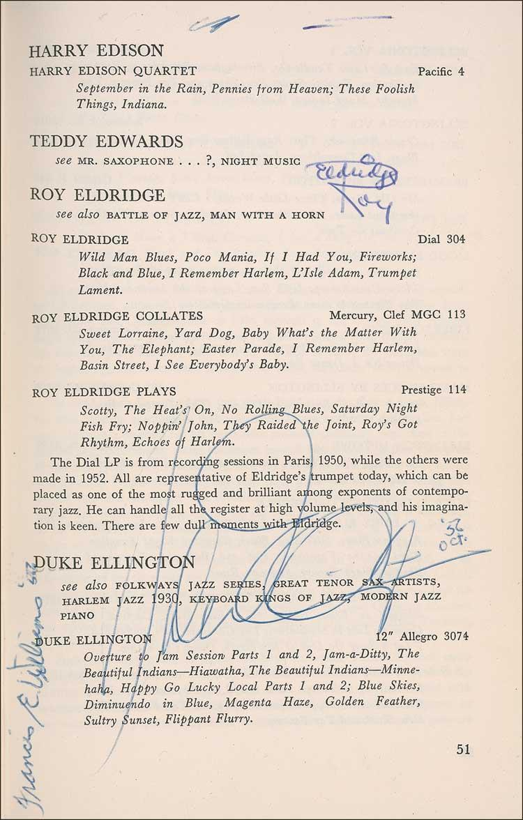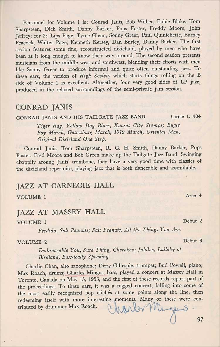 Signed book: A Guide to Longplay Jazz Records. First edition, first printing. NY: Long Player Publications, 1954. Hardcover with dustjacket, 5.75 x 8.5, 263 pages. Signed inside in ink by over 35 jazz greats, with almost all signing next to their respective entries in the book. Signers include: Charles Mingus, Miles Davis, Duke Ellington, Count Basie, Harry Carney (who spent 45 years in Ellington’s band), Max Roach (considered one of the most important drummers in history), Eddie Condon, Red Garland (who was a boxer who fought Sugar Ray Robinson before becoming a full time musician), Thom Wilson, Wild Bill Davison, Arthur Taylor, Roy Eldridge (referred to as one of the most exciting musicians of the Swing era), Erroll Garner, Dizzy Gillespie, Woody Herman, Milt Jackson (who discovered Dizzy Gillespie), Sara Vaughn, Gerry Mulligan, Lester Young, John Lewis, Kai Winding, J. J. Johnson, George Wein, Charles Bourgeois, Bud Powell, Gene Krupa, Sonny Stitt, Turk Murphy, Hampton Hawes, Oscar Peterson, Peewee Birdland, Shelly Maine, Charlie Marianno, Oscar Goodstein, Phineas Newborn, Pee Wee Russell, Jimmy and Marion McPartland, Red Garland, and Mugsy Spanier. In very good condition, with lists and notations to inside covers and free end pages, as well as old tape and toning, underlined passages and entries inside, partial separation to front free end pages from binding, owner’s stamp inside, and binding and spine a bit weak. Dustjacket has scattered paper loss, light rubbing and surface wear, and moderate creasing. RRAuction COA.