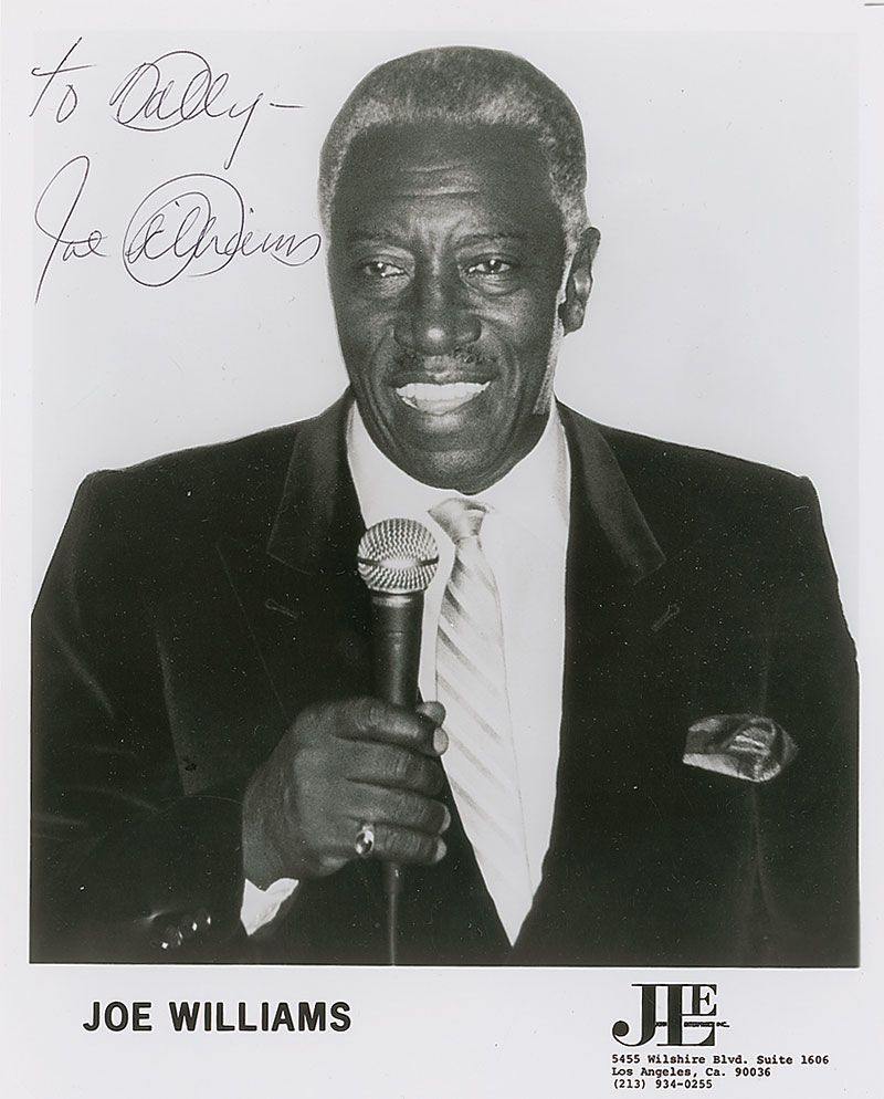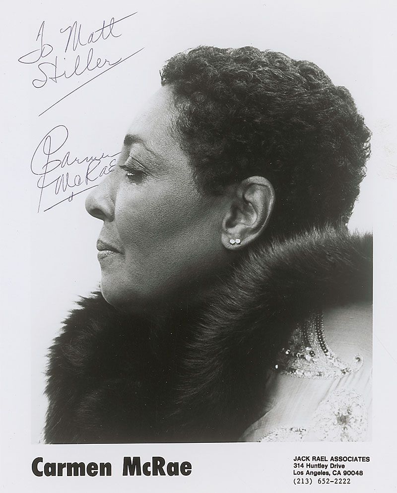 Glossy 8 x 10 publicity photos of Joe Williams and Carmen McRae, each signed and inscribed in black ballpoint by the singer pictured. In overall fine condition.