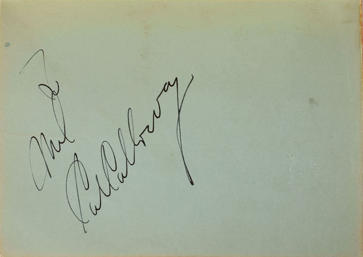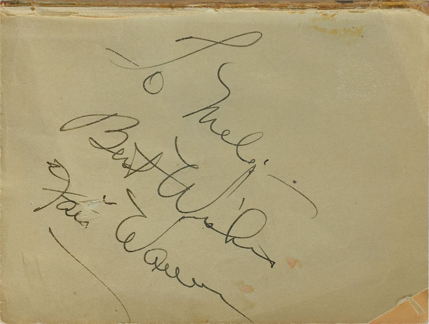 Partial vintage autograph booklet, 3.75 x 5, signed inside in ink by several notable jazz and big band legends, all adding an inscription to "Mel," including: Cab Calloway, Fats Waller, Benny Goodman, Gene Krupa, Harry James, Teddy Wilson, Martha Tilton, Art Rollins, Harry Goodman, Vincent Lopez, Billy Rose, Woody Herman, and Carol Channing. In very good to fine condition, with front and back covers no longer present.