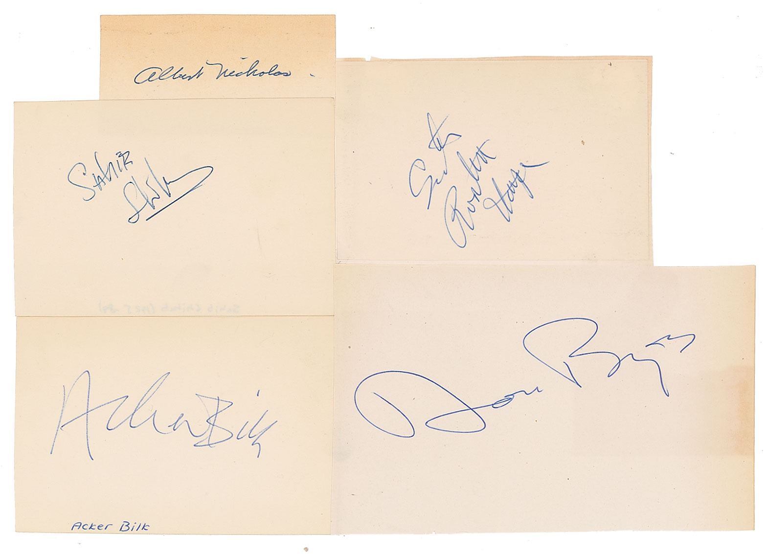 Five vintage ballpoint signatures of jazz and blues musicians on individual off-white slips, ranging in size from 3.5 x 1.75 to 6 x 4. Signers are: Sister Rosetta Tharpe, Don Byas, Acker Bilk, Albert Nicholas, and Sahib Sahib. In overall fine condition, with light toning to two of the slips.
