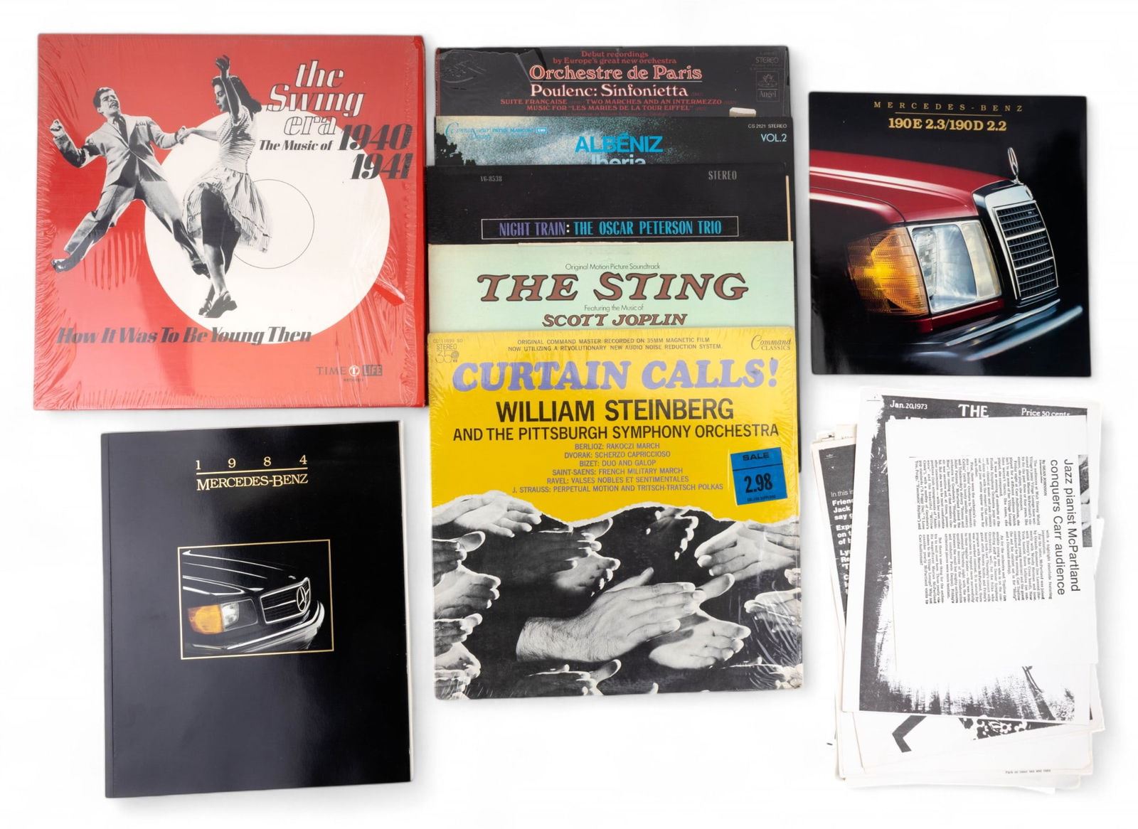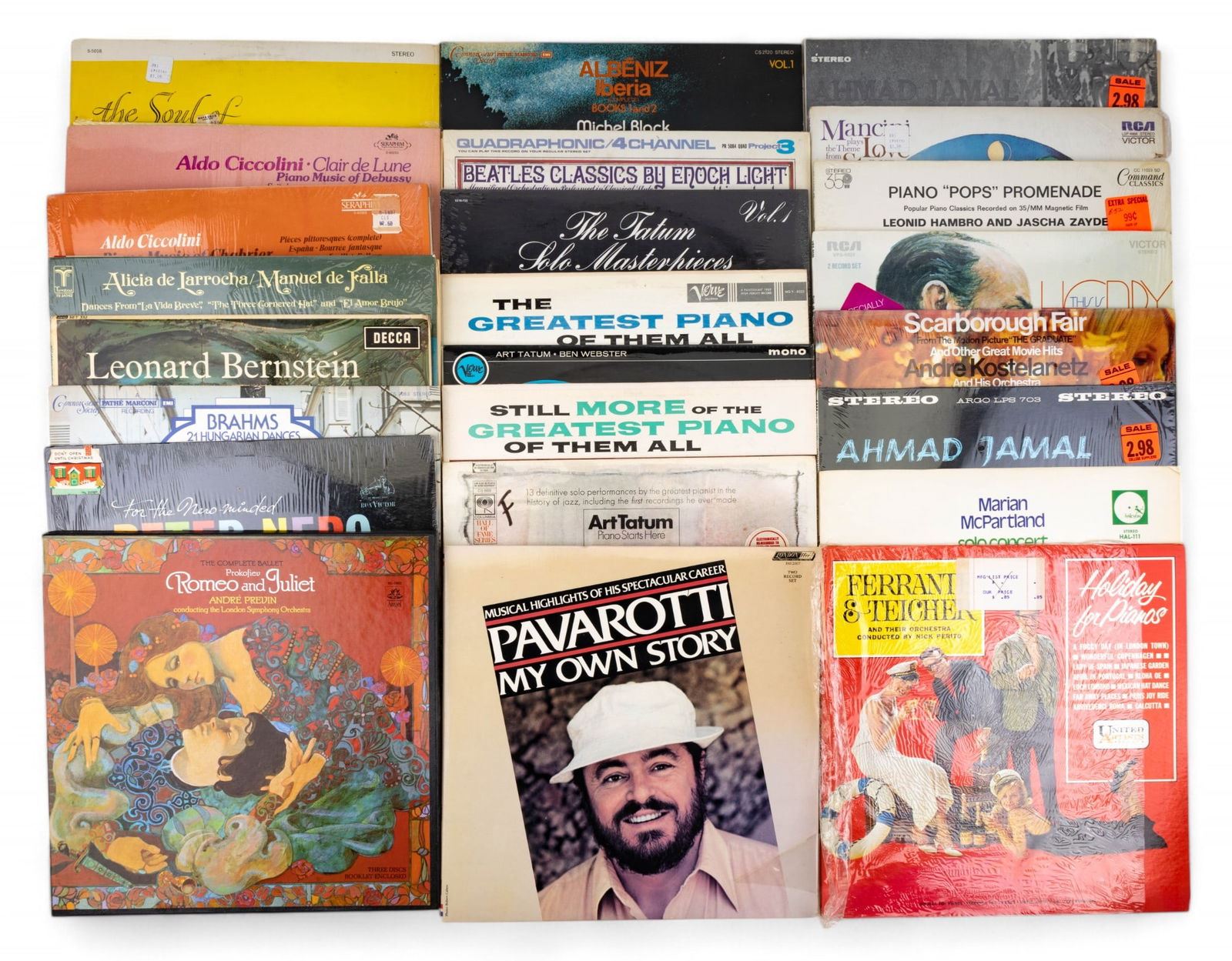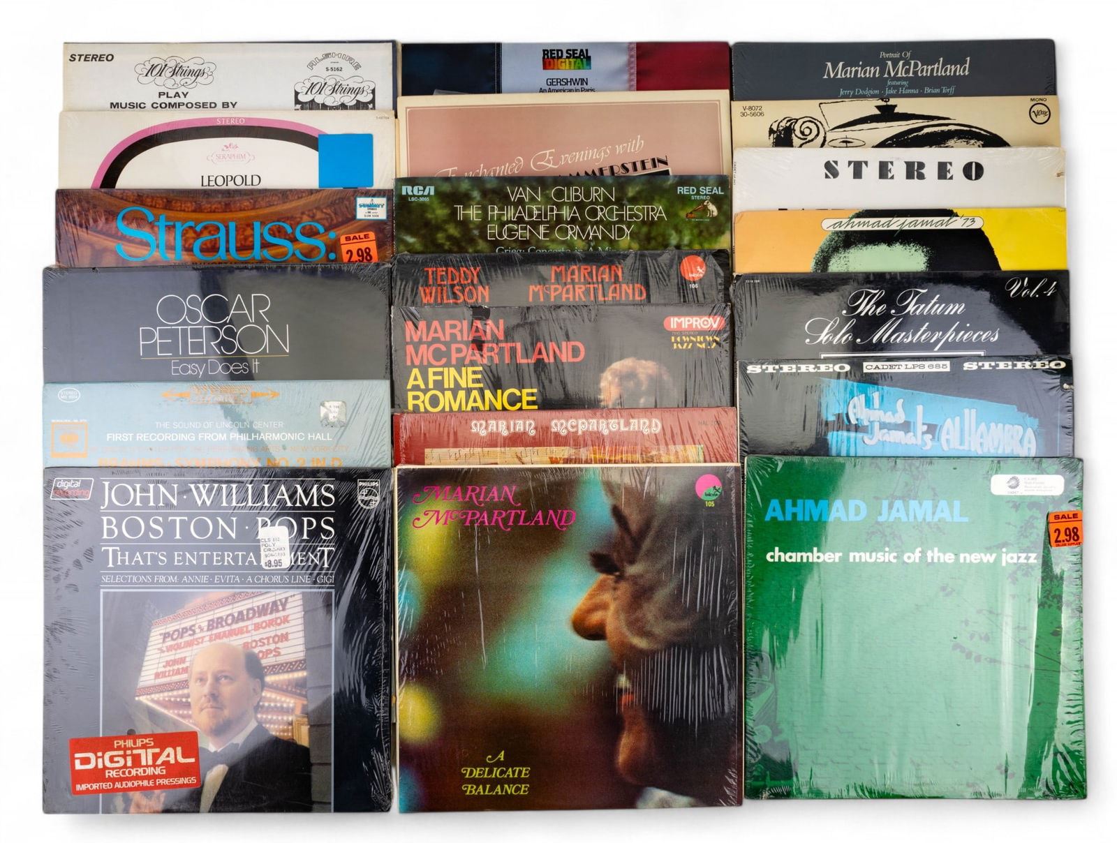 Over 100 assorted vinyl of mostly jazz and classical featuring several by Marian McPartland including promotional photos and materials; others by Oscar Peterson, Ahmad Jamal, Debussy, Brahms, Pavoratti, Henry Mancini, Leonard Bernstein, and more.