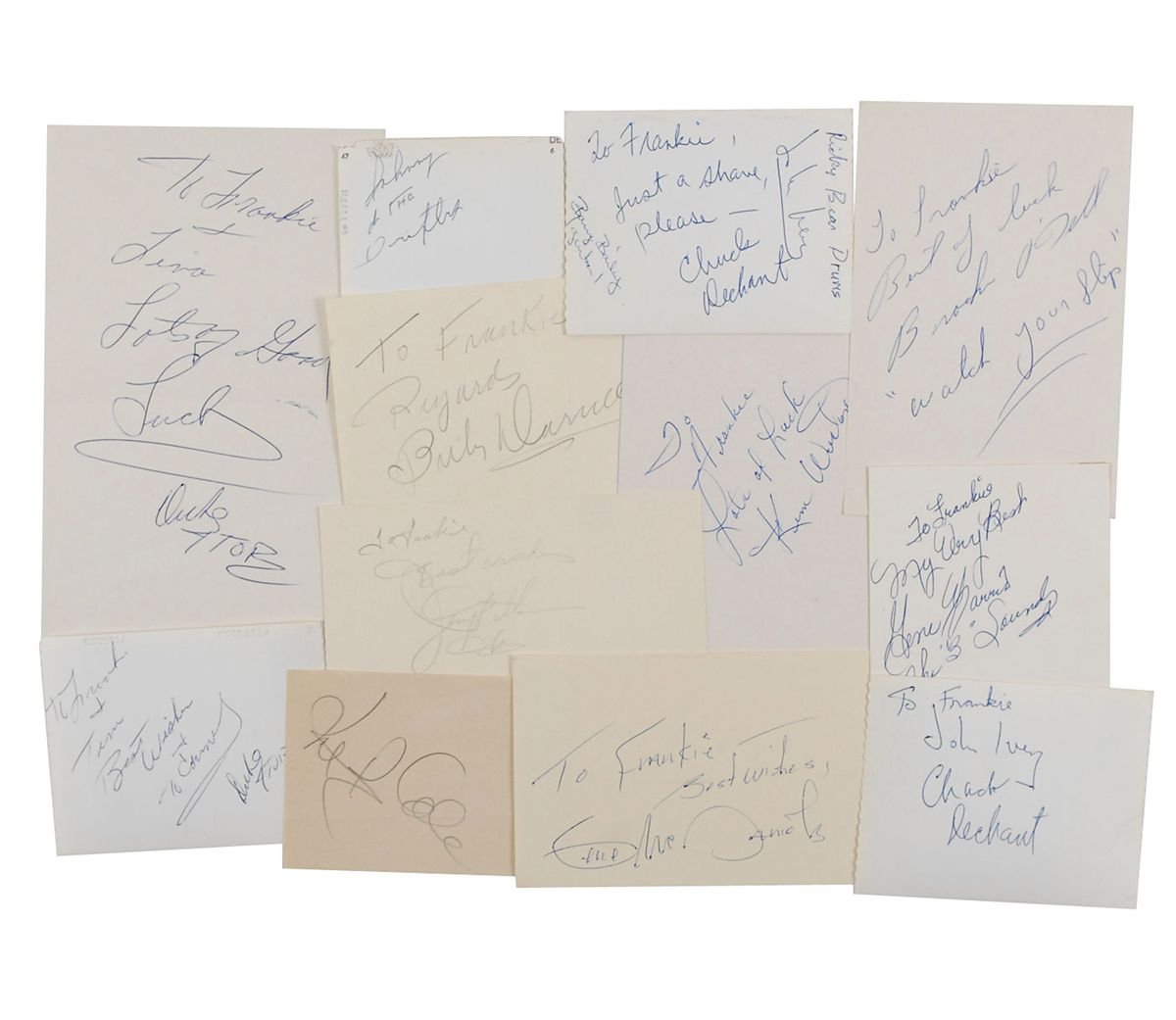 Collection of 12 items, consisting almost entirely of signatures, each signed in ink by a famous musician, many inscribed. Signers are: Gene McDaniels, Brooks O’Dell, Walter ‘Bunny’ Sigler, The Kommotions, Gene Harris, Abdul ‘Duke’ Fakir (2), Johnny Moore, Nat King Cole, Jerry Butler, Bill Darnell, and Kim Weston.
