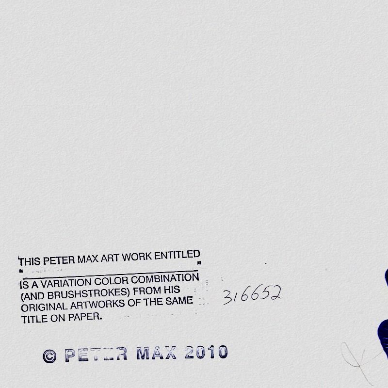 "Jazz" is a one-of-a-kind mixed media on paper, hand signed by Peter Max. The piece comes custom framed with a backside cutout to display Peter Max Studio registration number 316652 certifying authenticity. Measures approximately 48" x 36" (frame), 36" x 24" (image).