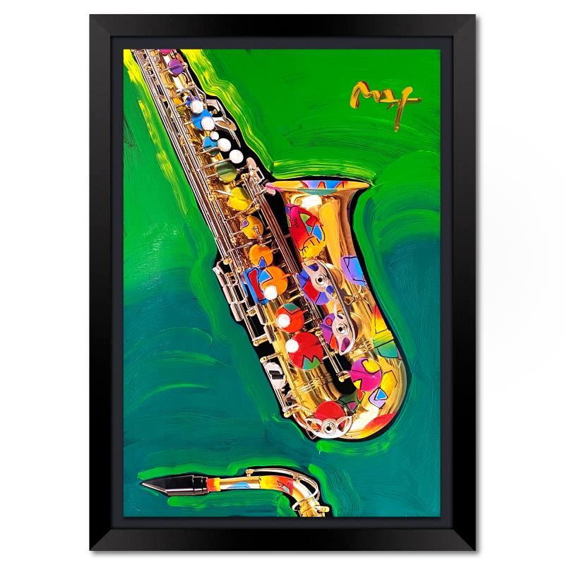 "Jazz" is a one-of-a-kind mixed media on paper, hand signed by Peter Max. The piece comes custom framed with a backside cutout to display Peter Max Studio registration number 319134 certifying authenticity. Measures approximately 42" x 30" (frame), 36" x 24" (image). This item requires special handling and may have a longer than usual turnaround.
