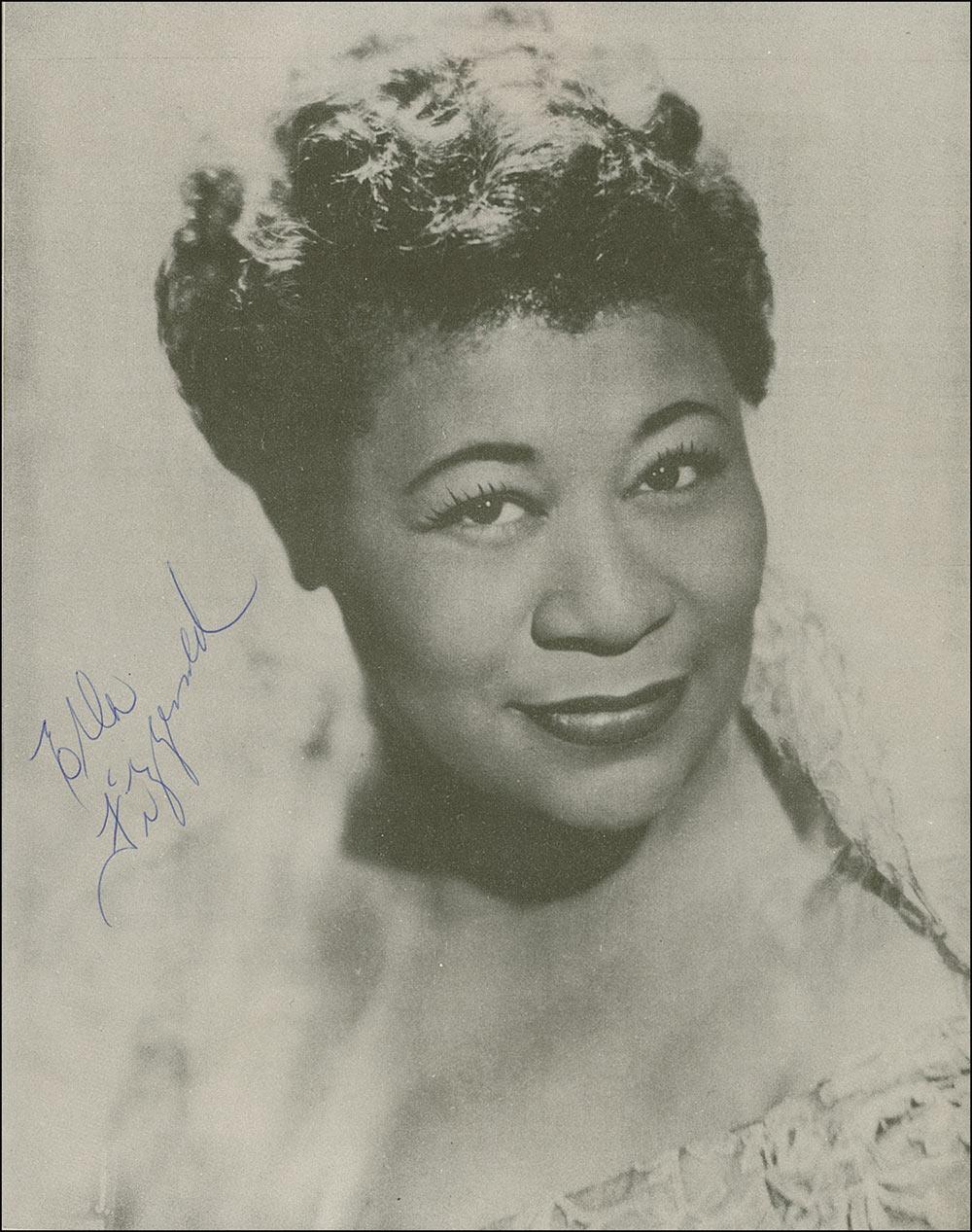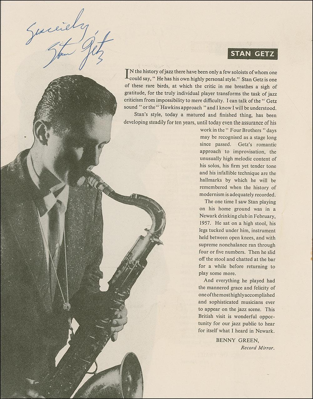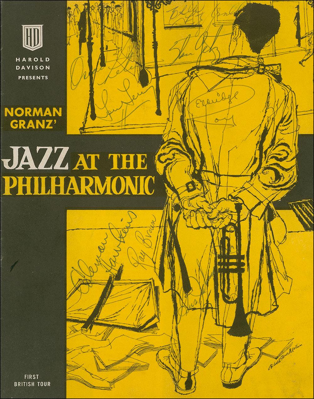 Norman Granz’ Jazz at the Philharmonic program, 8.25 x 10.5, labeled at the bottom “First British Tour.” Signed in ballpoint on the front cover and inside by 17 performers, with several signing on the front cover and again by their images inside. Signers include: Ella Fitzgerald (2), Stan Getz (2), Coleman Hawkins (2), Roy Eldridge (2), Oscar Peterson (2), Gus Johnson (2), Herb Ellis, and Ray Brown (2). In very good condition, with some light contrast to a couple of signatures on the front cover, light central vertical crease, and mild handling wear and soiling.