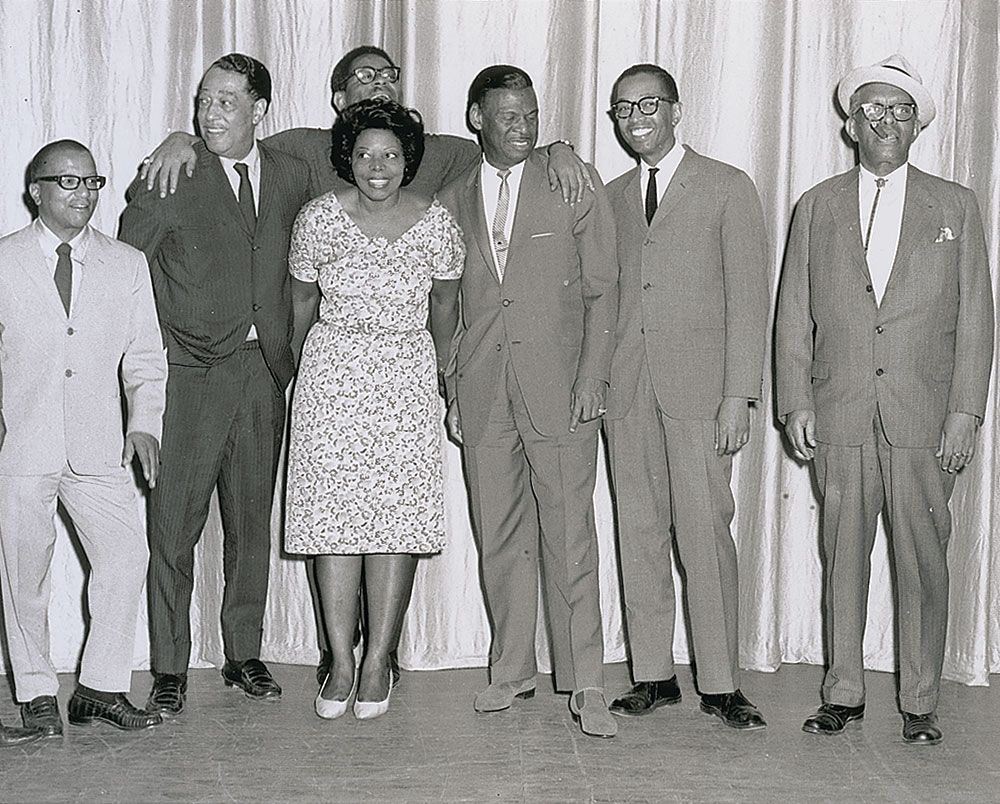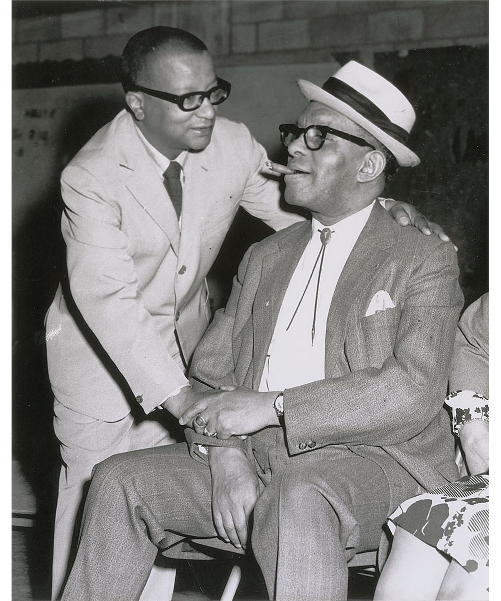 Three second generation glossy and satin-finish photos, originally taken by Teenie Harris, two 10 x 8 and one 8 x 10. One photo is of Billy Strayhorn sharing a moment with Willie ‘The Lion’ Smith; a group photo including Nat King Cole and Woody Herman; and a great group portrait of Billy Strayhorn, Duke Ellington, Mary Lou Williams, Dizzy Gillespie, Earl Hines, Billie Taylor, and Willie ‘The Lion’ Smith. In fine condition. Harris was an accomplished African-American photographer who chronicled life in the black neighborhoods of the city for the Pittsburgh Courier. His work was rarely seen outside of Pittsburgh, until after his death in 1998.