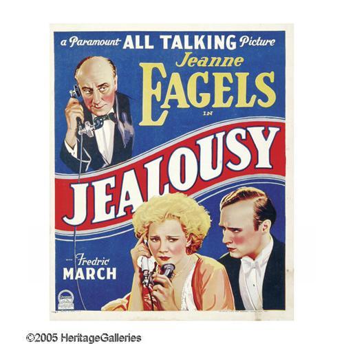 <B>Jealousy (Paramount, 1929).</B></I> Window Card (14" X 17"). Jeanne Eagels was, in her day, one of America's most respected film actresses. Her portrayal of Leslie Crosbie in the 1929 version of "The Letter" earned her a Best Actress Oscar nomination. "Jealousy" was only her second sound motion picture, but sadly, it was also her last. Jeanne Eagels tragically died of a possible heroin overdose less than one month after this film's release. This rare poster has the added peculiarity of picturing Eagels and her first co-star before replaced, Anthony Bushell. Eagels had chosen the English actor Bushell as her leading man, but he was replaced by Fredric March in the middle of filming. It is possible that Bushell's voice recorded poorly and was unsuitable. The pressbook shows the one sheet as picturing March. Why Bushell was left on the window card, we will never know. This window card has a slight corner stain and the imprint area has been trimmed. Fine/Very Fine.