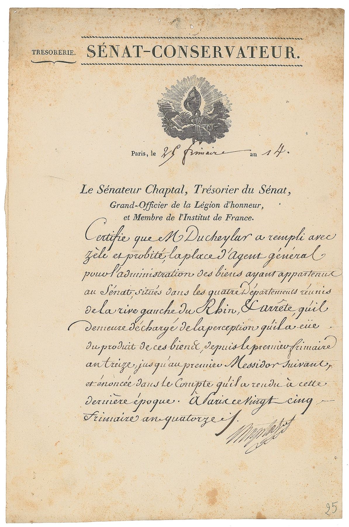 Versatile French chemist and statesman (1756–1832) who introduced the process of adding sugar to wine, called 'Chaptalization.' LS in French, signed “J. Chaptal,” one page, 7.75 x 12, Senat-Conservateur letterhead, December 20, 1805. Untranslated letter as treasurer of the senate. In very good to fine condition, with scattered light foxing and staining, and several small tack-sized holes to the top.