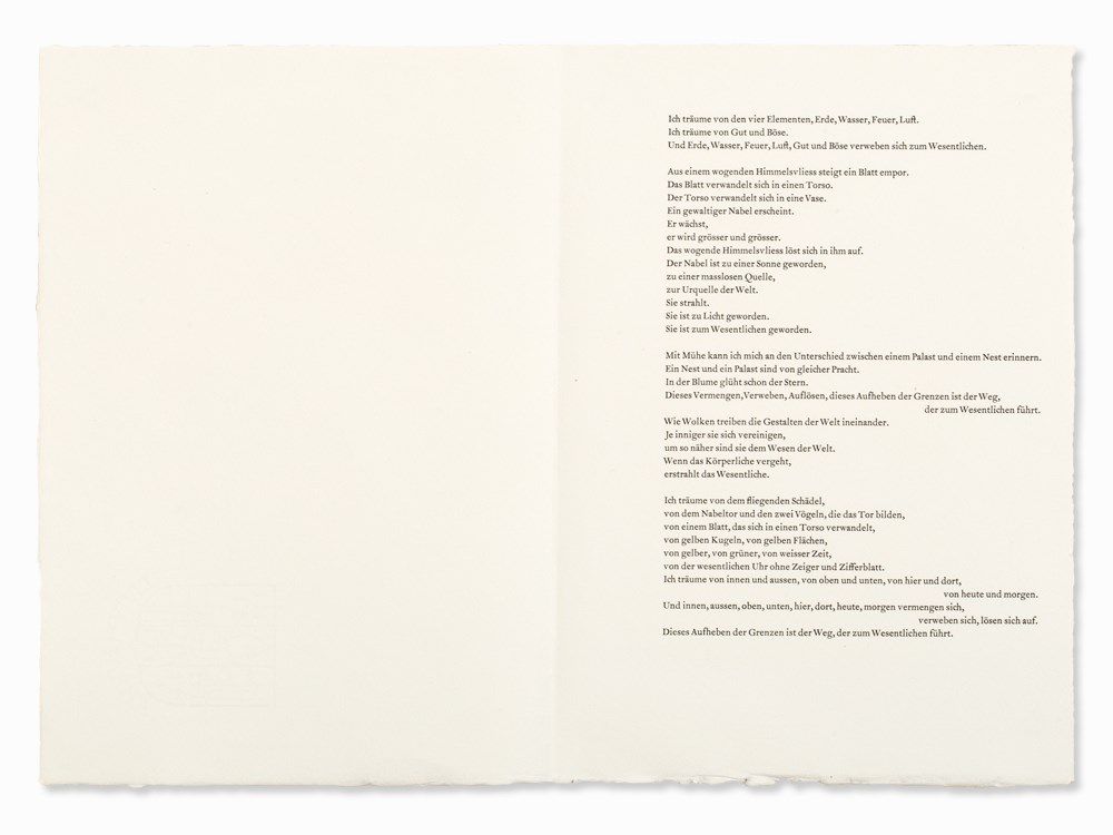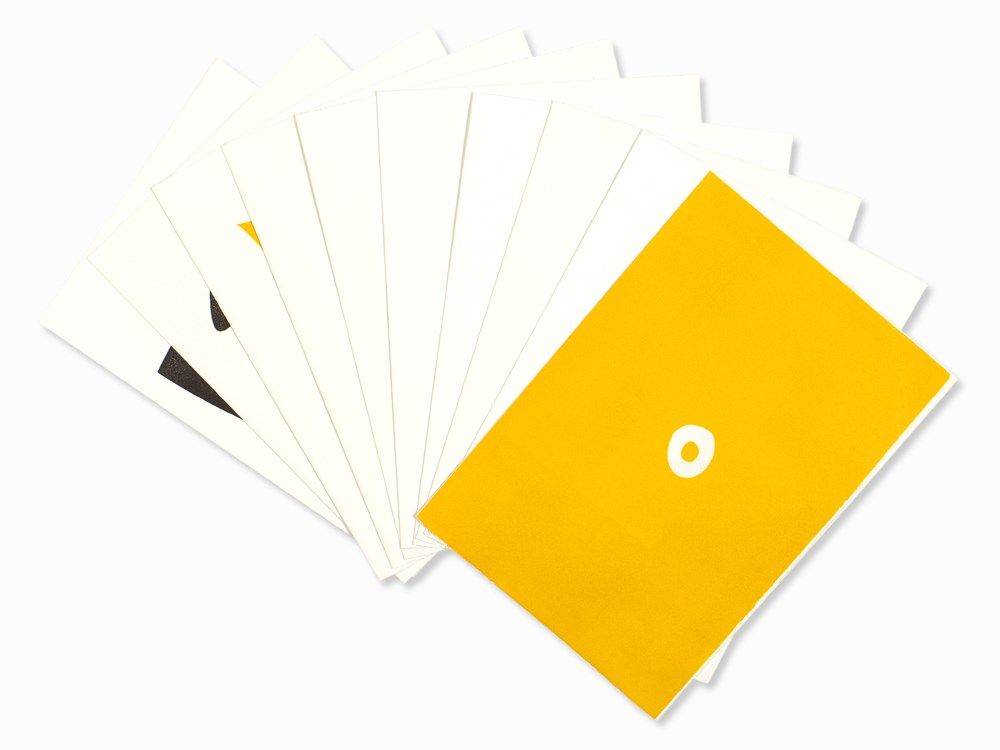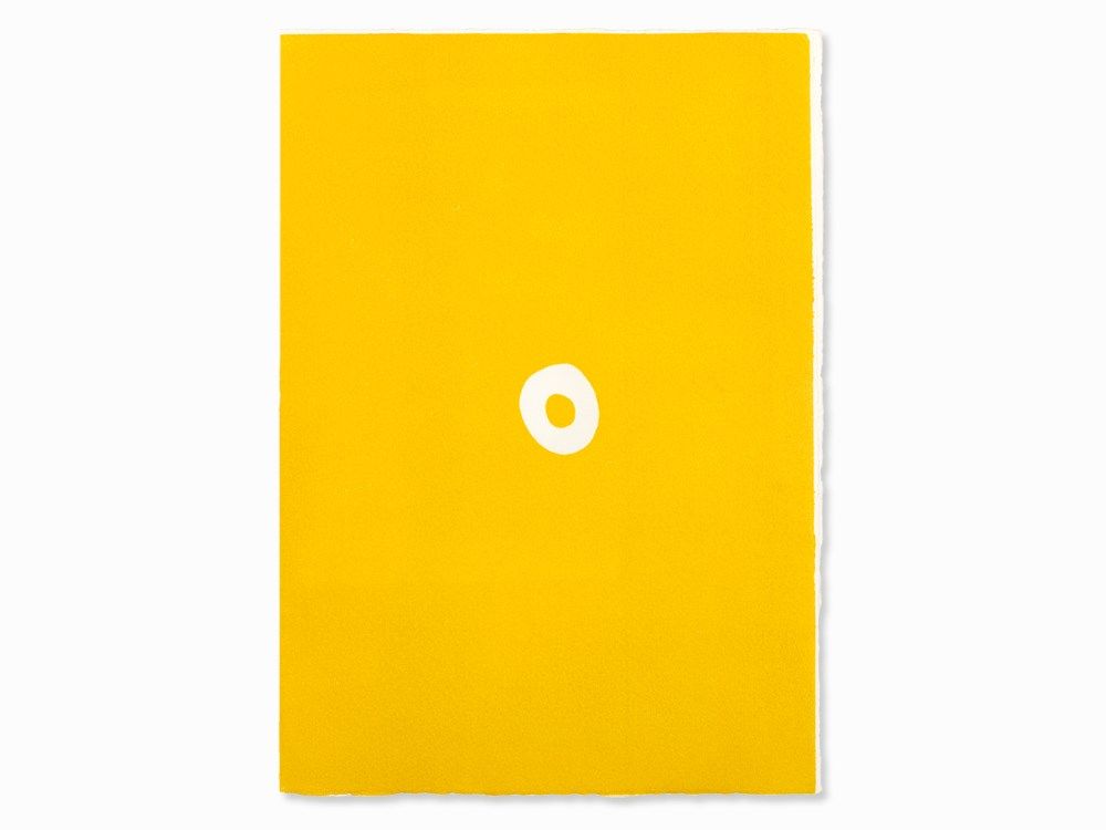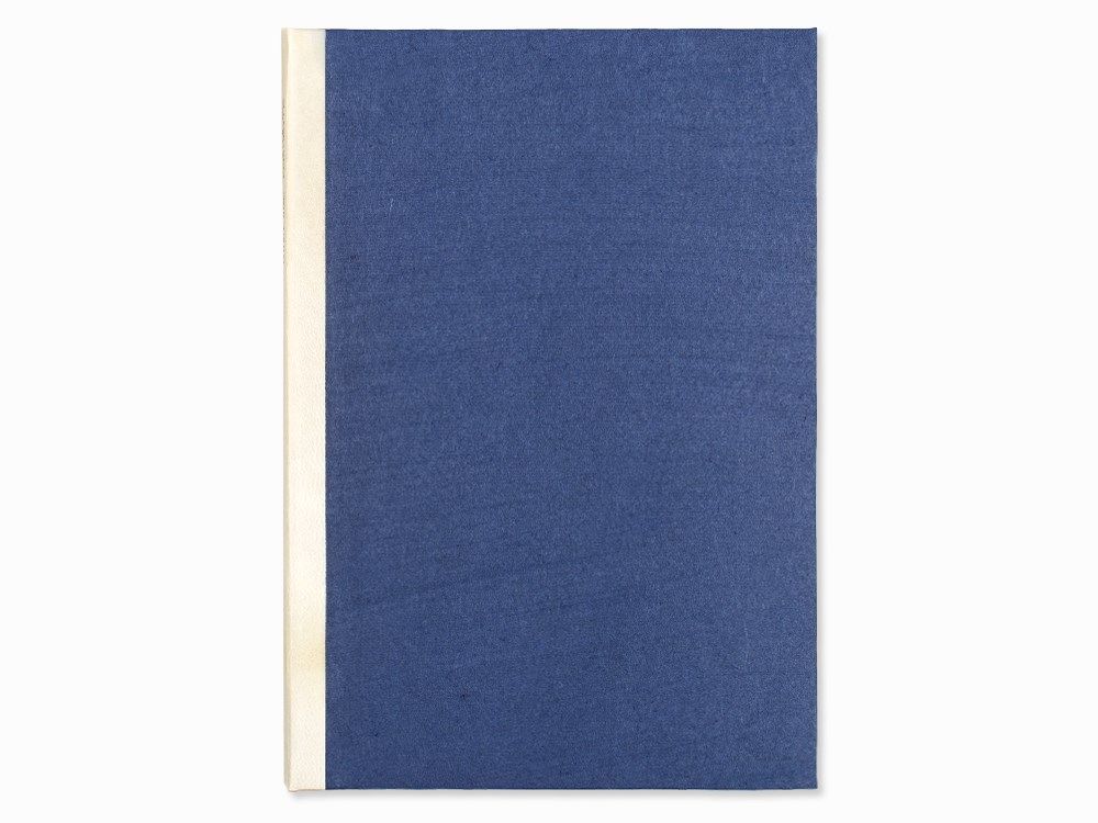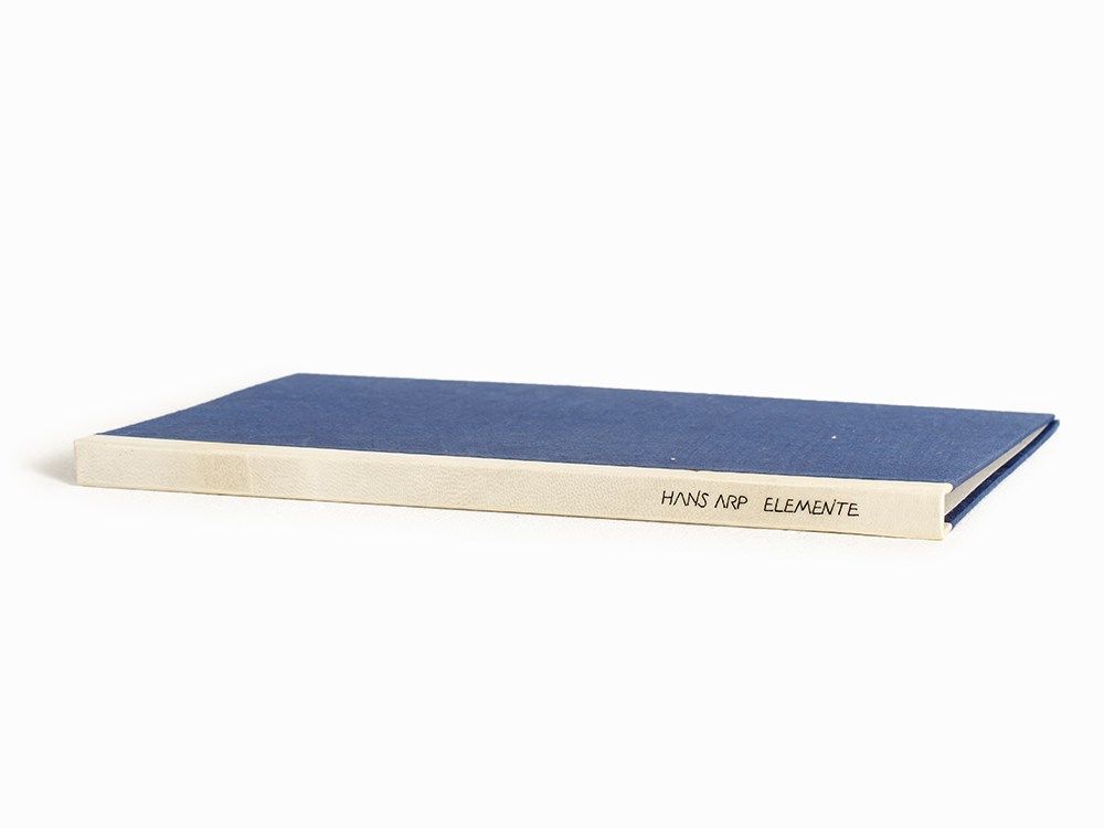 This anthology titled ‘Elemente’ by the German-French artist Jean Arp (1886-1966), also known under his German name Hans Arp, includes ten woodcuts on ‘Duca di Parma’ laid paper and show abstract compositions in yellow, black and white. The printing blocks were cut in 1949 by Karl Schmid and printed by hand, supervised by the artist, after his designs from 1920. They were published in 1950 as a ‘2. Stubendruck’ in Zurich. One sheet is printed on ‘C. M. Fabriano Italia’ laid paper bearing the titles ‘Ein irdischer Buchstabe’ and ‘Ich träume von dem fliegendem Schädel‘. The index which contains all of the works’ titles is also included in the anthology. The woodcuts come in a portfolio made of blue cardboard with a vellum spine and a white cardboard boxed set.