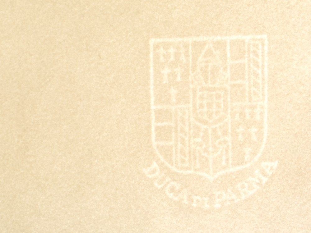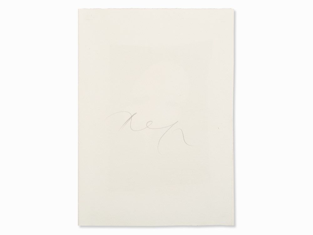 The woodcuts of the portfolio are in very good condition with only tiny brown spots. The boxed set is slightly rubbed and the blue cardboard shows minimal foxing en verso. The anthology is signed in pencil by the artist as well as numbered with ‘101/200’. Nine sheets show the water mark ‘Duca di Parma’ on the lower left and one sheet bears the water mark ‘C. M. Fabriano Italia‘ on the lower right. The overall dimensions of the portfolio are 31 x 22 cm and the dimensions of the sheets are 29.5 x 21 cm.
