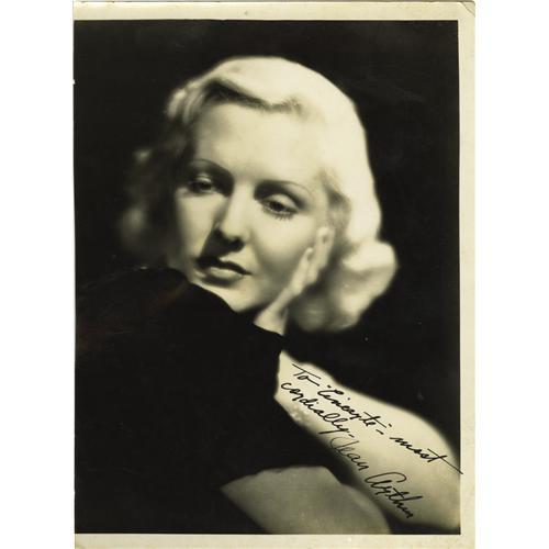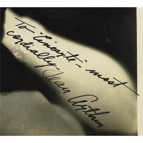 <B>Jean Arthur Autographed Portrait.</B></I> Jean Arthur was an irreplaceable actress, delightful in comedy, powerful in drama and unforgettable in such films as <I>Mr. Deeds Goes to Town</B></I> (1936), <I>Mr. Smith Goes to Washington</B></I> (1939) and <I>Shane</B></I> (1953), and on Broadway as <I>Peter Pan</B></I> (1950). Ms. Arthur signed this attractive mid-1930s still portrait in black fountain pen - "To 'Cinearte' - most cordially - Jean Arthur" ("Cinearte" was a South American film magazine.) The verso is stamped by photographer William A. Fraker, Columbia Studios. The left border has been trimmed, and some glue damage has partially obliterated the stamped "Jean Arthur Columbia Player" on the verso, but has not affected the front of the still. Jean Arthur is a difficult autograph to obtain in any form and this is a beauty! Very Fine + condition.<BR><BR><b>Shipping:</b> Flat Material, Small (<a target="_blank" href="http://www.heritageauctions.com/common/shipping.php">view shipping information</a>)