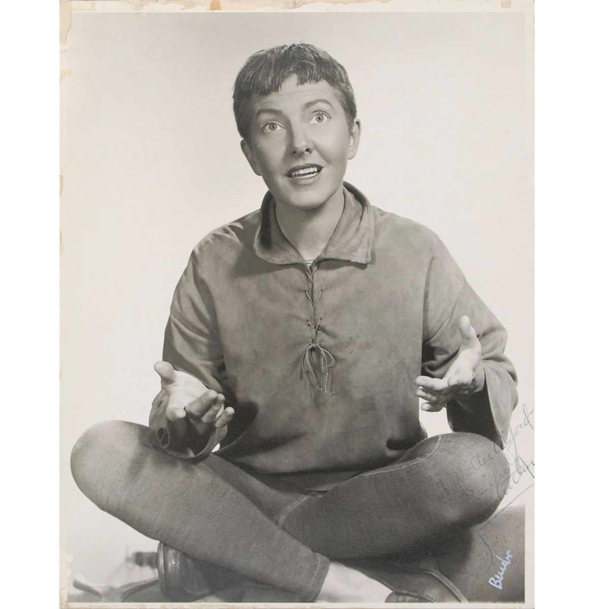 Scarce vintage matte-finish 11 x 14 photo of Arthur as Peter Pan, signed and inscribed in blue ballpoint, “To Walter Alford—Sincerely, Jean Arthur.” Photo has been affixed to a slightly larger mount. Some mounting and adhesive remnants and surface loss to edges, which could be matted out, and light contrast to first name of signature, otherwise fine condition. Arthur is rather uncommon in signed photos, and this is only the second Peter Pan photo we have ever offered.