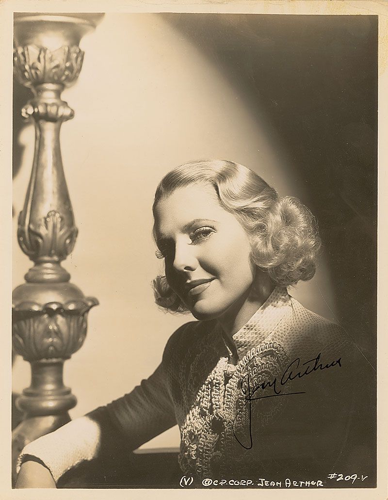 American actress (1900–1991) best known for her comic roles in such classics as Mr. Deeds Goes to Town and The More the Merrier. With the notable exceptions of A Foreign Affair and Shane, she effectively retired from the screen in 1944. Uncommon vintage glossy 8 x 10 photo of Arthur bathed in soft light, signed in fountain pen. In fine condition, with some light creasing along top border.