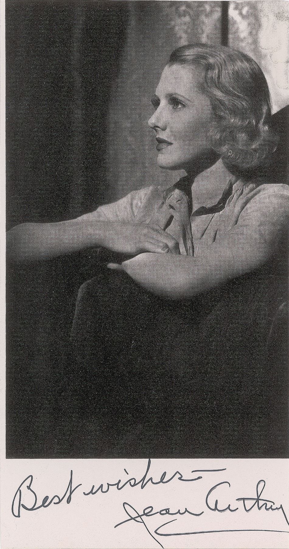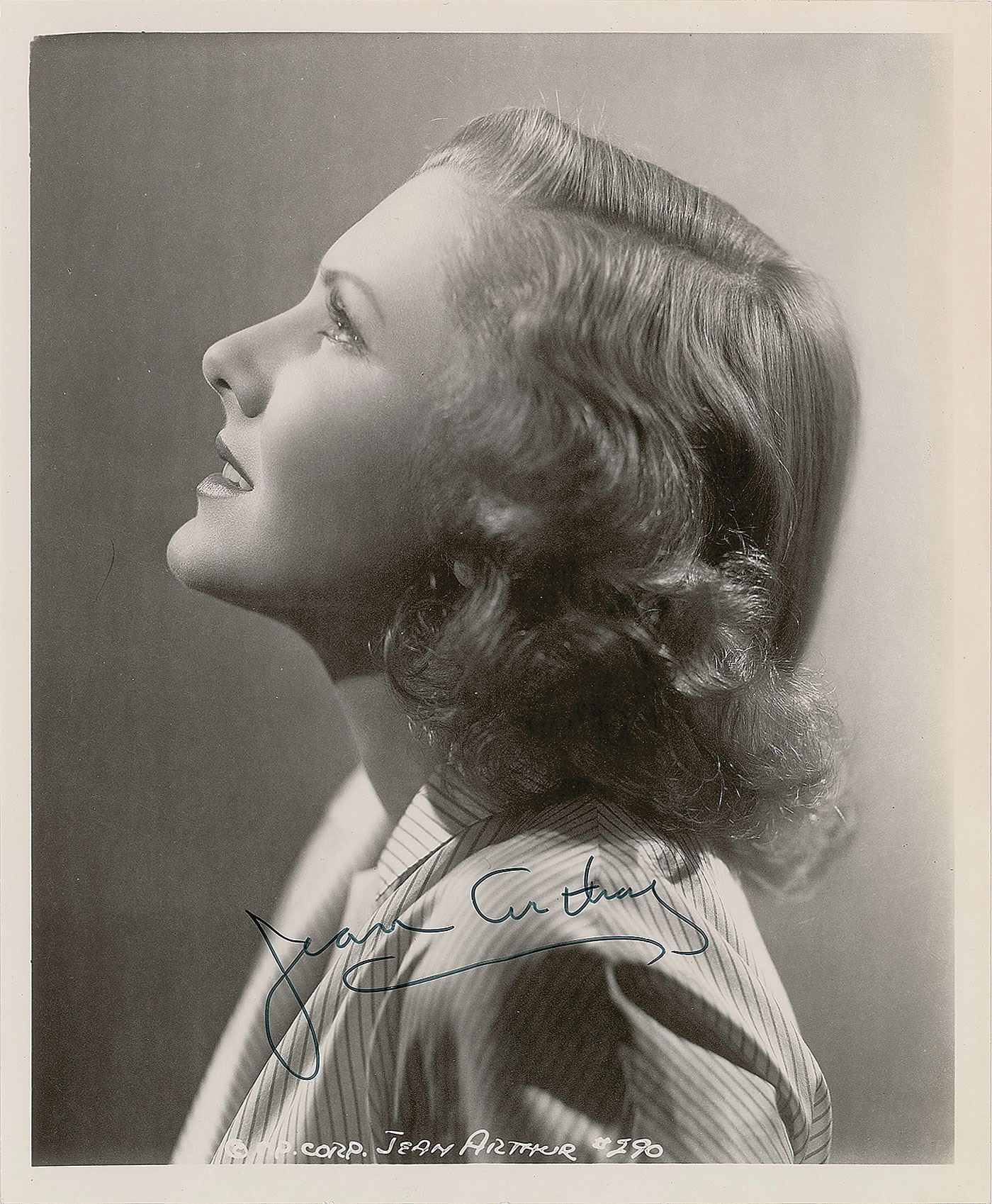 Two photos: a glossy 8 x 9.75 Columbia Pictures studio portrait of Arthur in a lovely profile pose, signed in black felt tip, "Jean Arthur"; and a semi-glossy 3.75 x 7 trimmed book photo of Arthur seated in shadow, signed in the lower border in thin black felt tip, "Best wishes—Jean Arthur." In overall fine condition.