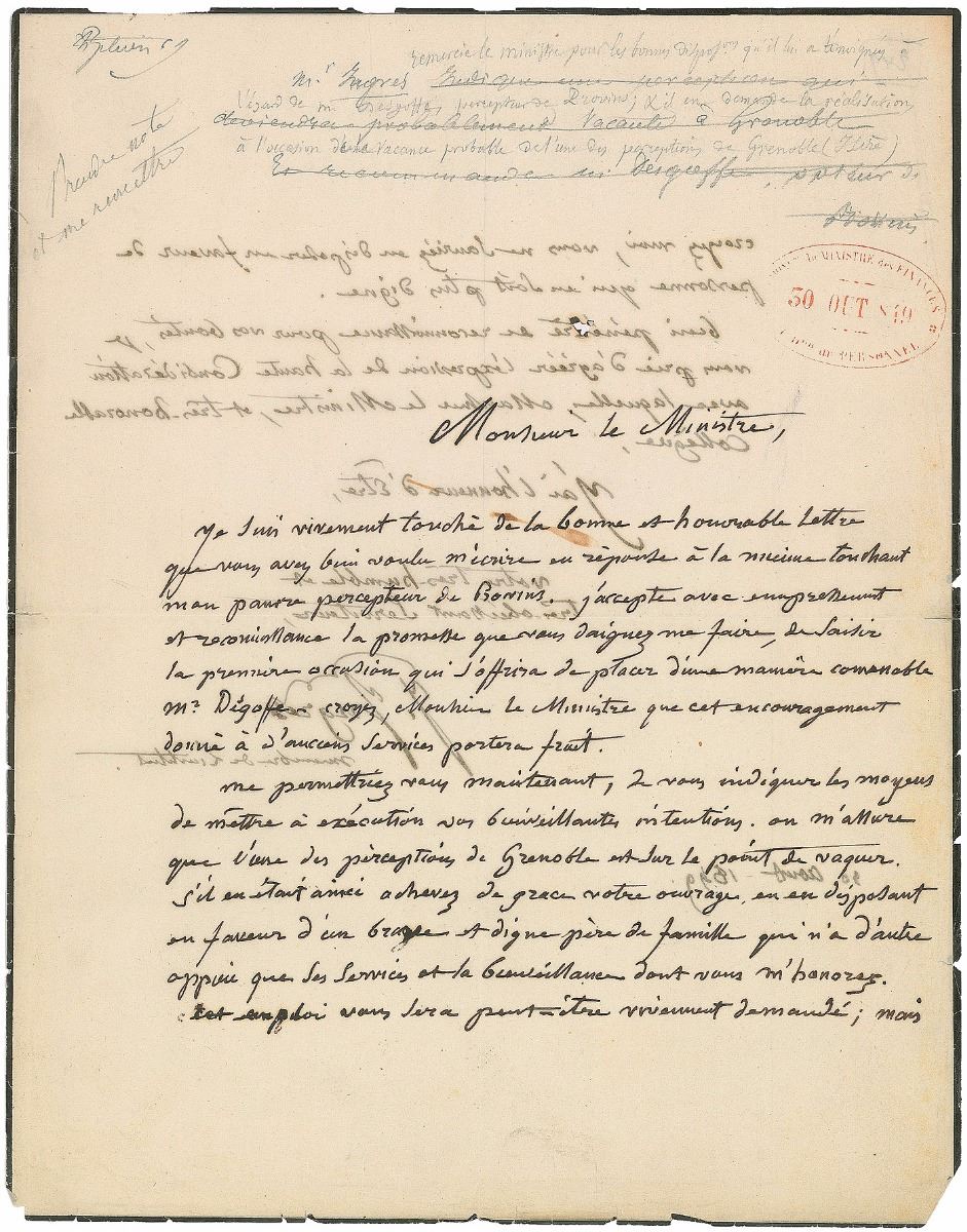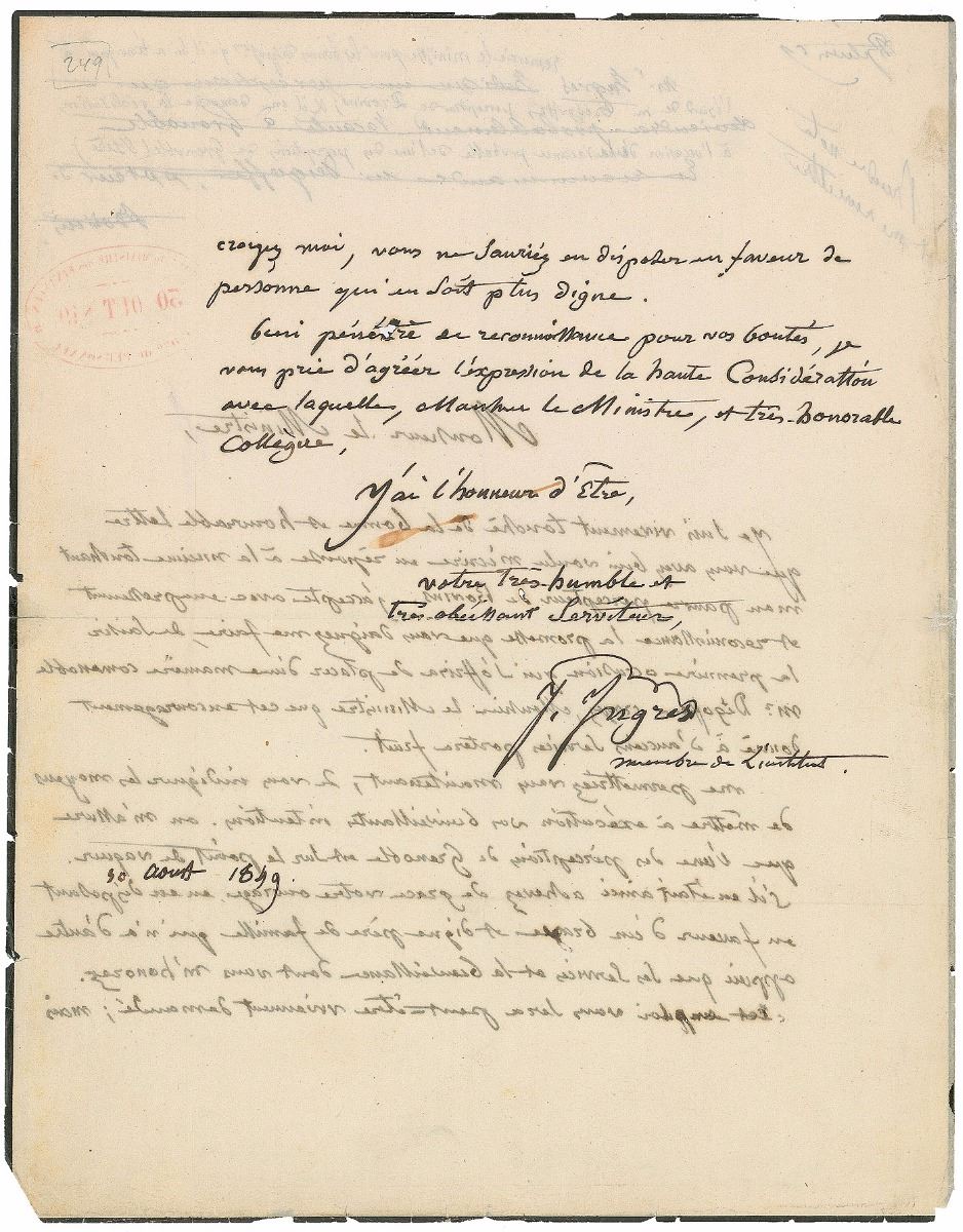 French Neoclassical painter (1780–1867). Untranslated ALS in French, signed “J. Ingres,” one page both sides, 8.25 x 10.5, August 30, 1849. In very good to fine condition, with chipping to fragile edges, small holes from ink erosion, and show-through from writing to opposing sides.