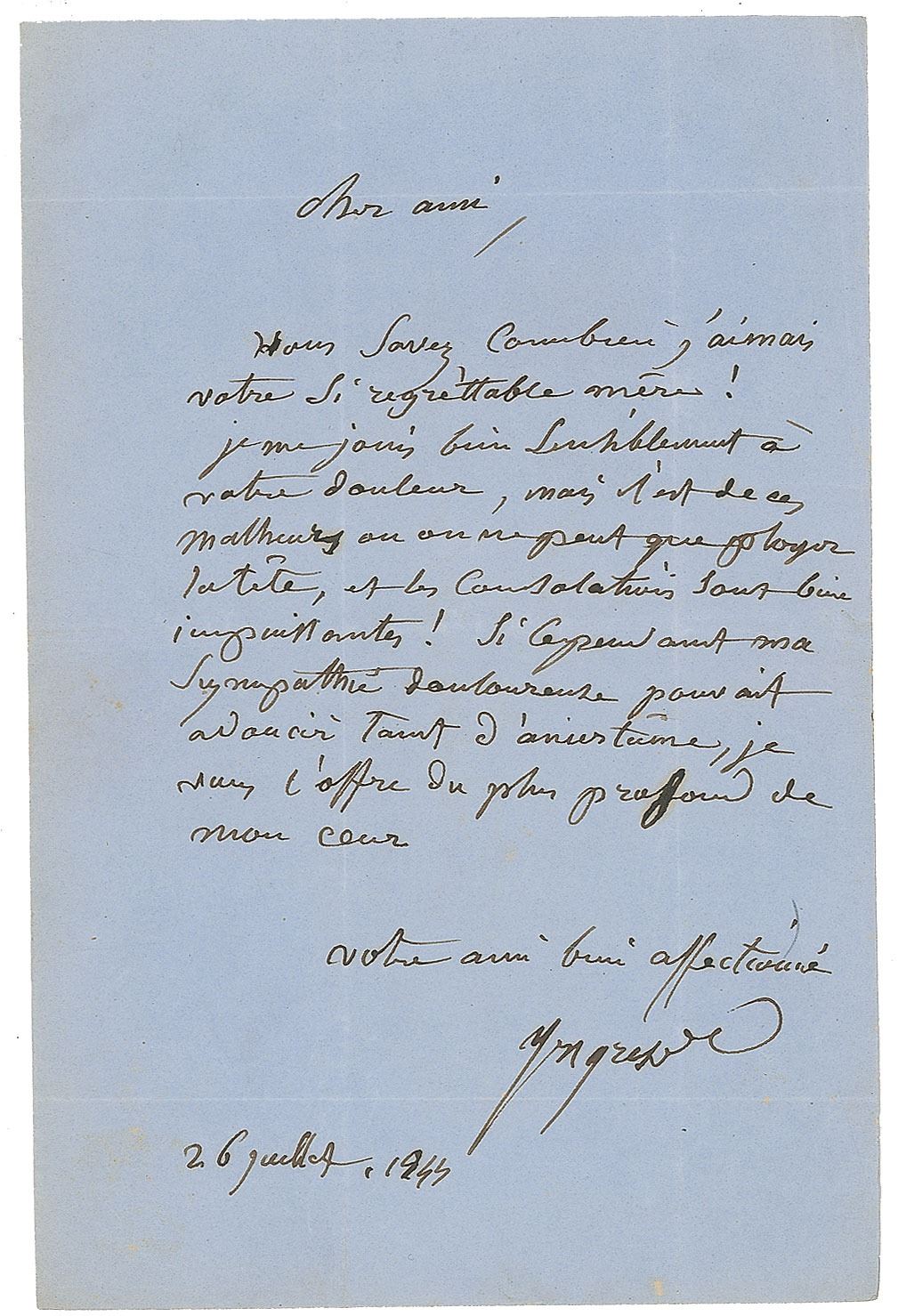 ALS in French, signed “J. Ingres,” one page, 5.25 x 8, July 26, 1855. Letter to Charles-Leon Vinit, the director of the Ecole Royale des beaux-Arts, in full (translated): "You know how much I loved your so much regretted mother. I join fully in your grief but it is in these misfortunes that one can do nothing but bow down one's head, and consolations have no power. If, however, my sad sympathy could relieve your bitter sorrow, I offer it to you from the bottom of my heart." In very good to fine condition, with light overall creasing. Accompanied by a receipt from noted autograph dealer Kenneth Rendell.