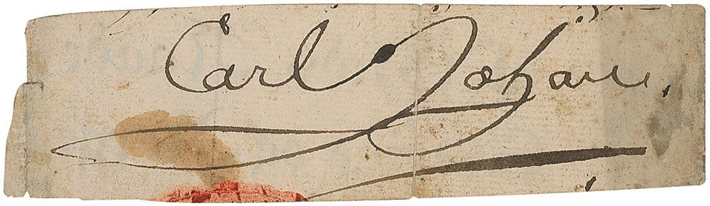 French marshall of Napoleon who became King of Sweden (as Charles XIV Johan) and King of Norway (as Charles III John) from 1818 until his death. Bold ink signature, “Carl Johan,” on an off-white 5.75 x 1.75 slip clipped from a larger document and affixed to a slightly larger slip. In very good condition, with three vertical folds through single letters of signature and scattered moderate toning and soiling.