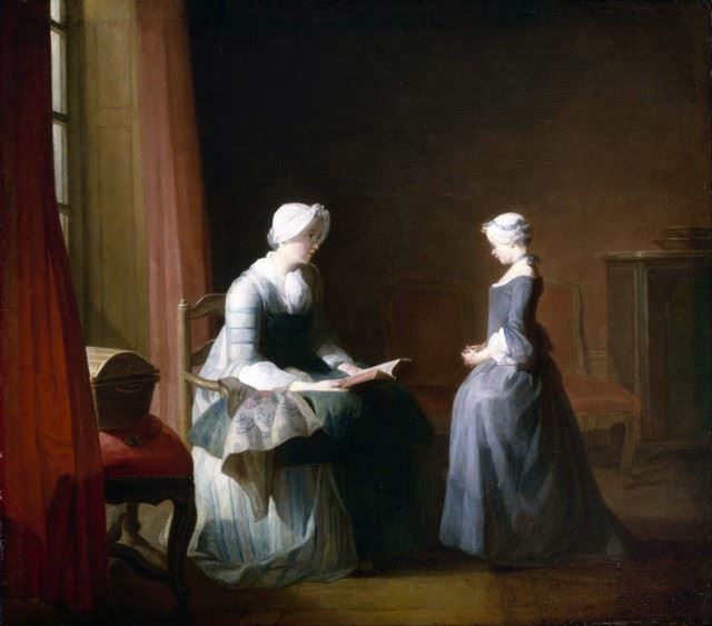 Artist: Jean Baptiste Chardin - Title: The Good Education - Medium: Fine Art Reproduction Giclee on Canvas - Image Size: Approximately 28 inches x 32 inches - Unframed on Unstretched Canvas - Biography: Jean-Baptiste-Simeon Chardin (November 2, 1699 - December 6, 1779) was an 18th-century French painter. He is considered a master of still life, and is also noted for his genre paintings which depict kitchen maids, children, and domestic activities. Carefully balanced composition, soft diffusion of light, and granular impasto characterize his work.