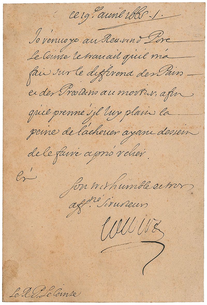 French politician (1619–1683) who served as the minister of finance under King Louis XIV. LS in French, signed “Colbert,” one page, 4.25 x 6.5, April 19, 1668. A significant letter on the opposition of the "Pairs" (the highest rank of French nobility) and the “Presidents à mortier," the principal magistrates of the highest juridical institutions). In very good condition, with moderate overall foxing. Accompanied by an unsigned engraved portrait of Colbert.