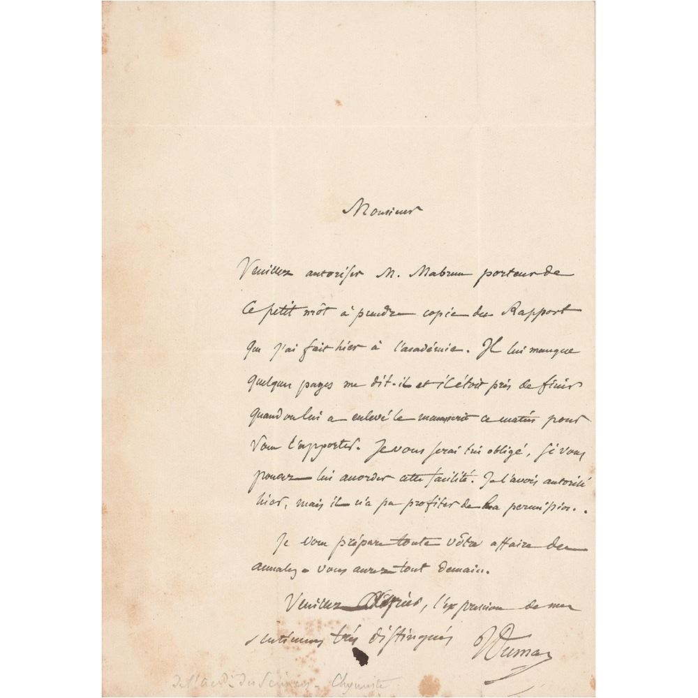 French chemist (1800"“1884) best known for his work in determining atomic and molecular weights. ALS in French, signed "J. Dumas," one page, 7 x 9.75, no date. In part (translated): "Please authorize Mr. Mabrun"¦to take a copy of the report I made here at the academy. He was missing a few pages"¦and he was ready to finish when he got the manuscript written." In fine condition, with some scattered staining.