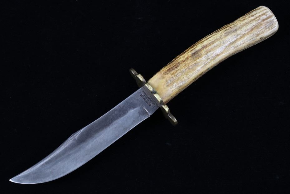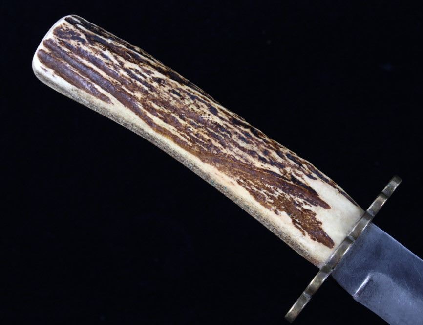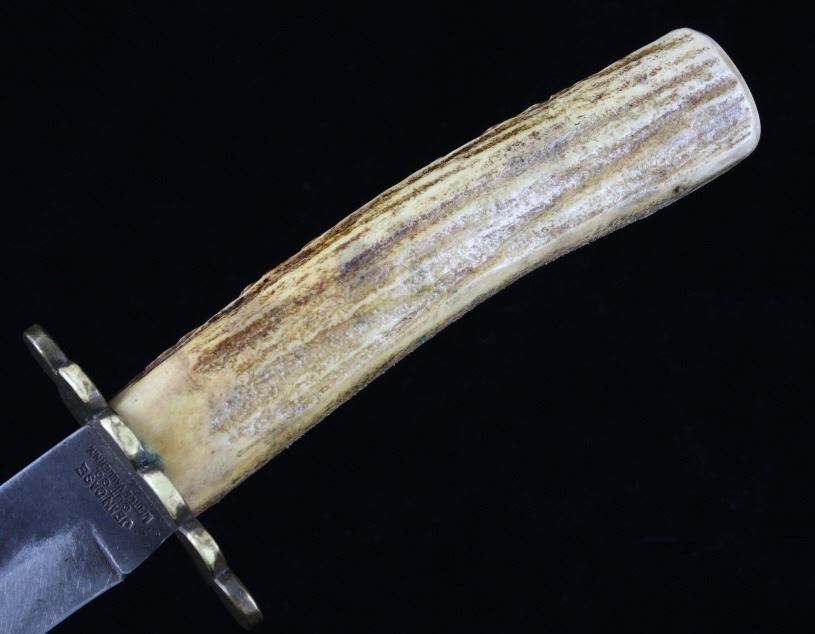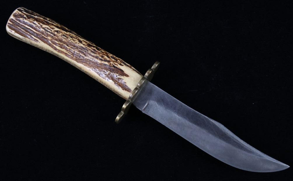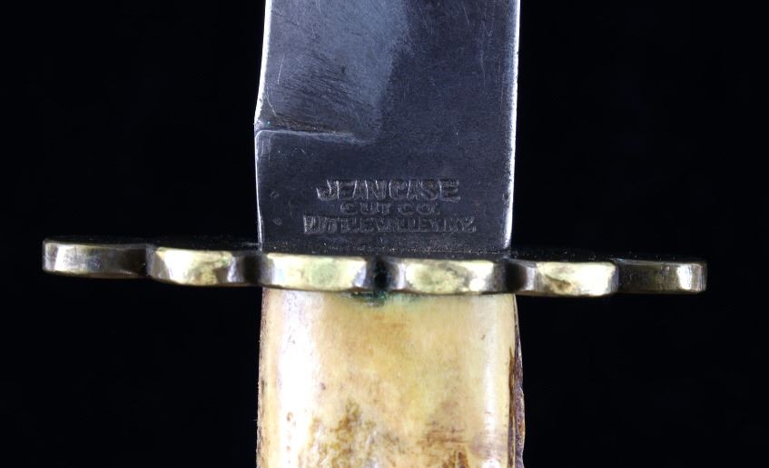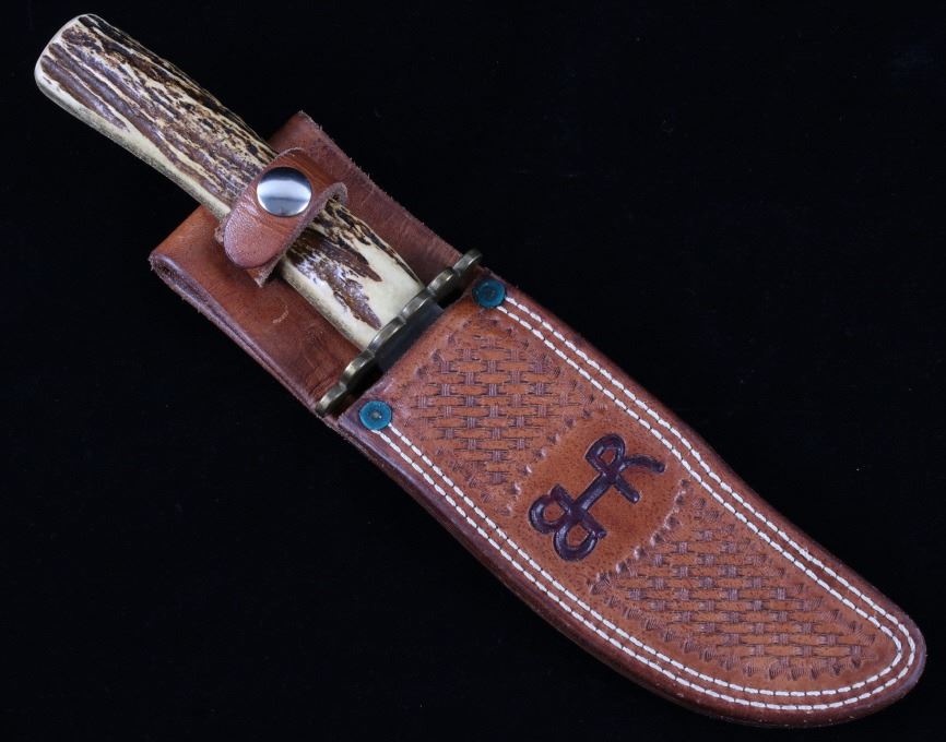 Offered in this lot we have a Jean Case Cut Co antler handle clip point hunting knife and leather sheath. The knife displays a steel blade with a single cutting edge and a clip point bowie style blade design. The blade is marked near the guard reading "Jean Case Cut Co. Little Valley, N.Y.". The piece shows a deer antler grip with the brass guard showing half circle ridges across the border of the guard. The knife comes with a hand tooled leather sheath with a tooled weave patterns and marked "B R" in a branding iron style lettering. The piece shows good condition overall with some wear due to age and use. The knife measures10 3/4" long overall with the blade measuring 5 1/2" long.