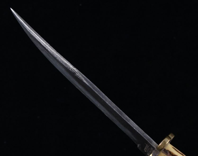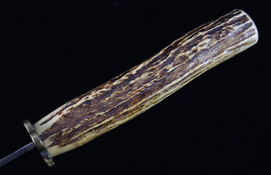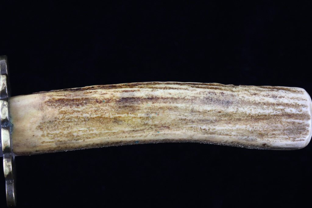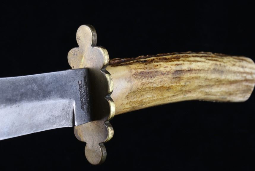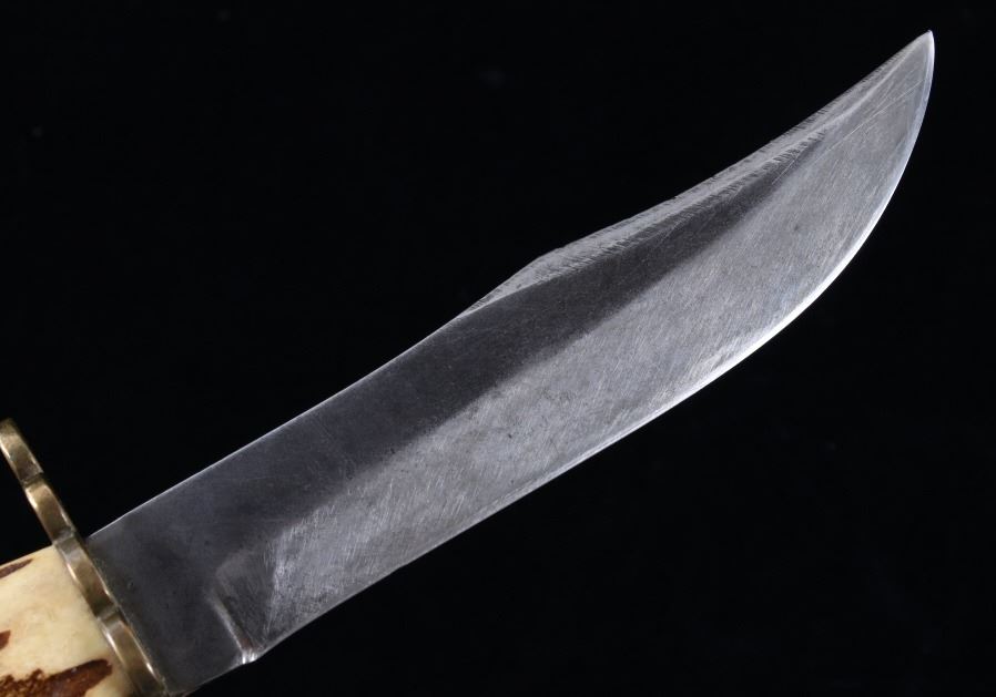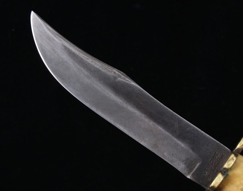 Offered in this lot we have a Jean Case Cut Co antler handle clip point hunting knife and leather sheath. The knife displays a steel blade with a single cutting edge and a clip point bowie style blade design. The blade is marked near the guard reading "Jean Case Cut Co. Little Valley, N.Y.". The piece shows a deer antler grip with the brass guard showing half circle ridges across the border of the guard. The knife comes with a hand tooled leather sheath with a tooled weave patterns and marked "B R" in a branding iron style lettering. The piece shows good condition overall with some wear due to age and use. The knife measures10 3/4" long overall with the blade measuring 5 1/2" long.