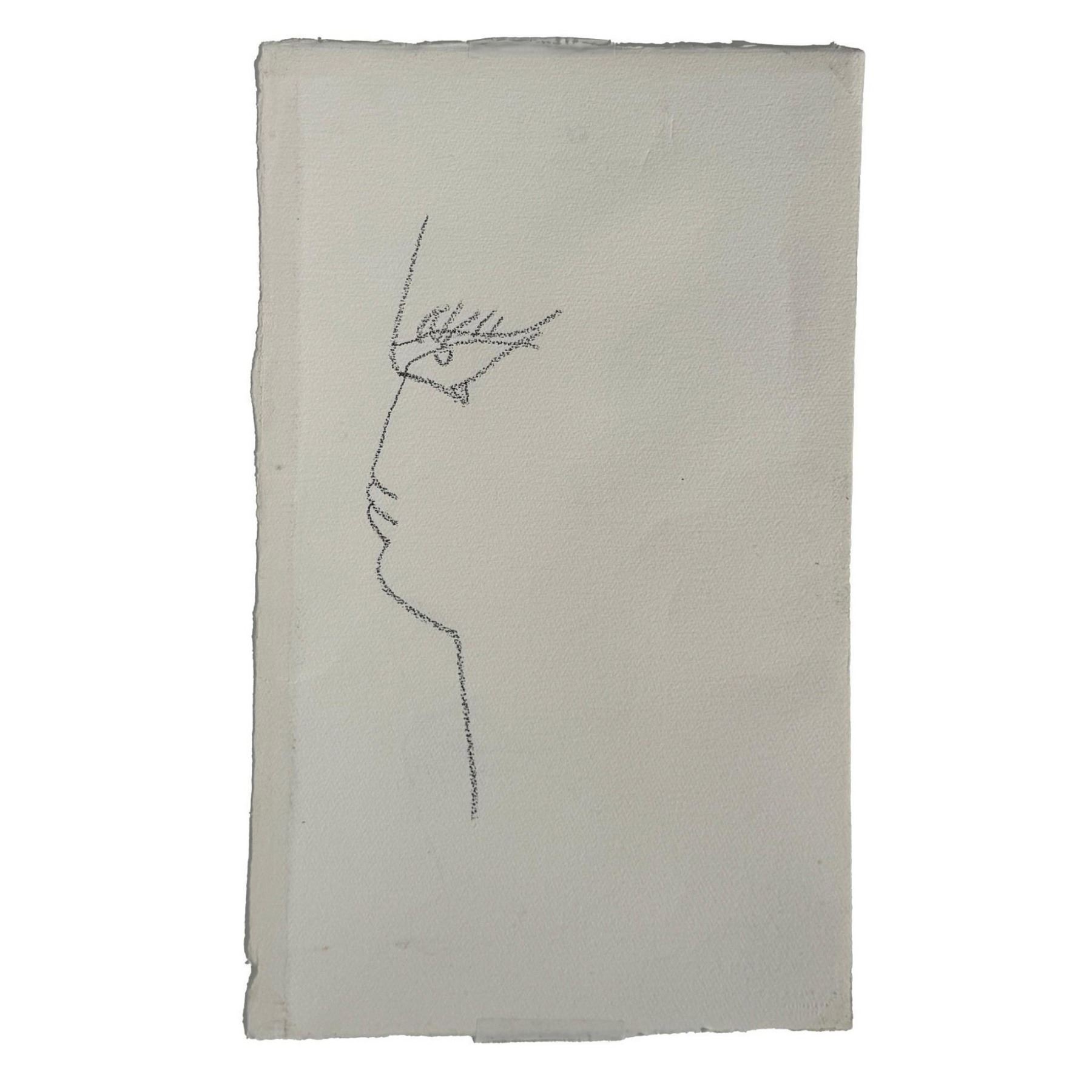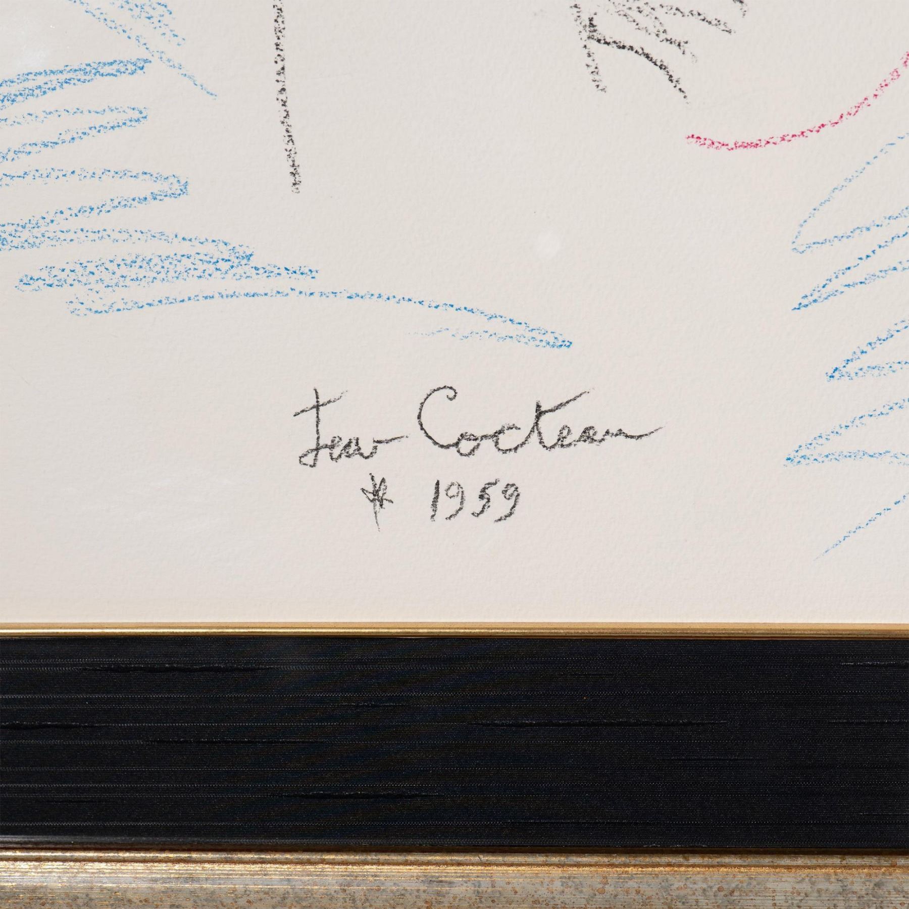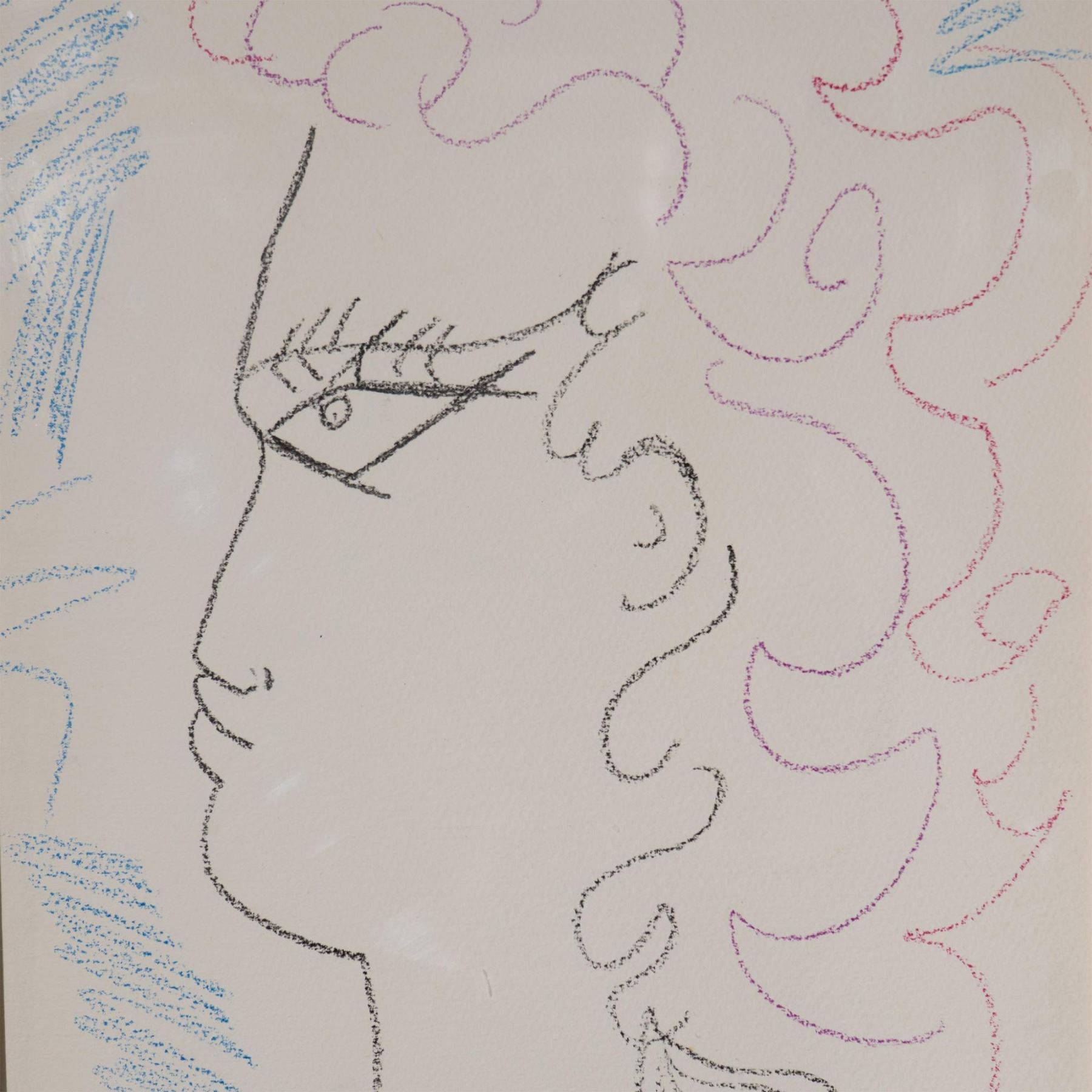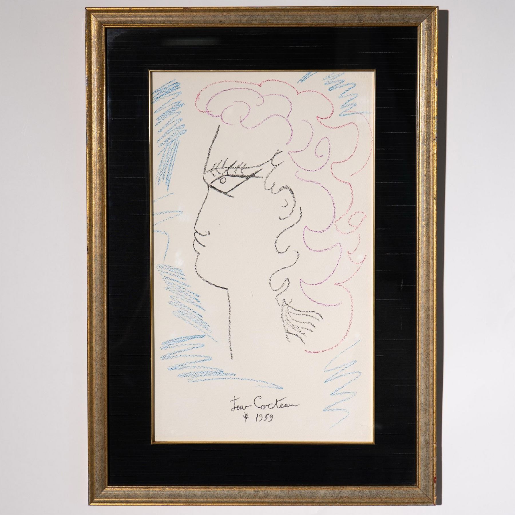 Profil a l'Oeil de Poisson (Profile with a Fish Eye) is an original color drawing attributed to French poet and artist Jean Cocteau. The sheet includes a partially finished second profile on its verso (not signed.) Blind embossing on upper right edge: Veritable Papier D'Arches Torchon (handmade paper from France.) Signature with star and date on lower center: Jean Cocteau 1959. Housed in a lightly gilded frame with a black mat. Sight size: 12.50"L x 21.50"H. Frame dimensions: 20"L x 28.75"H x 0.75"W. Artwork can be unframed and rolled for shipment.