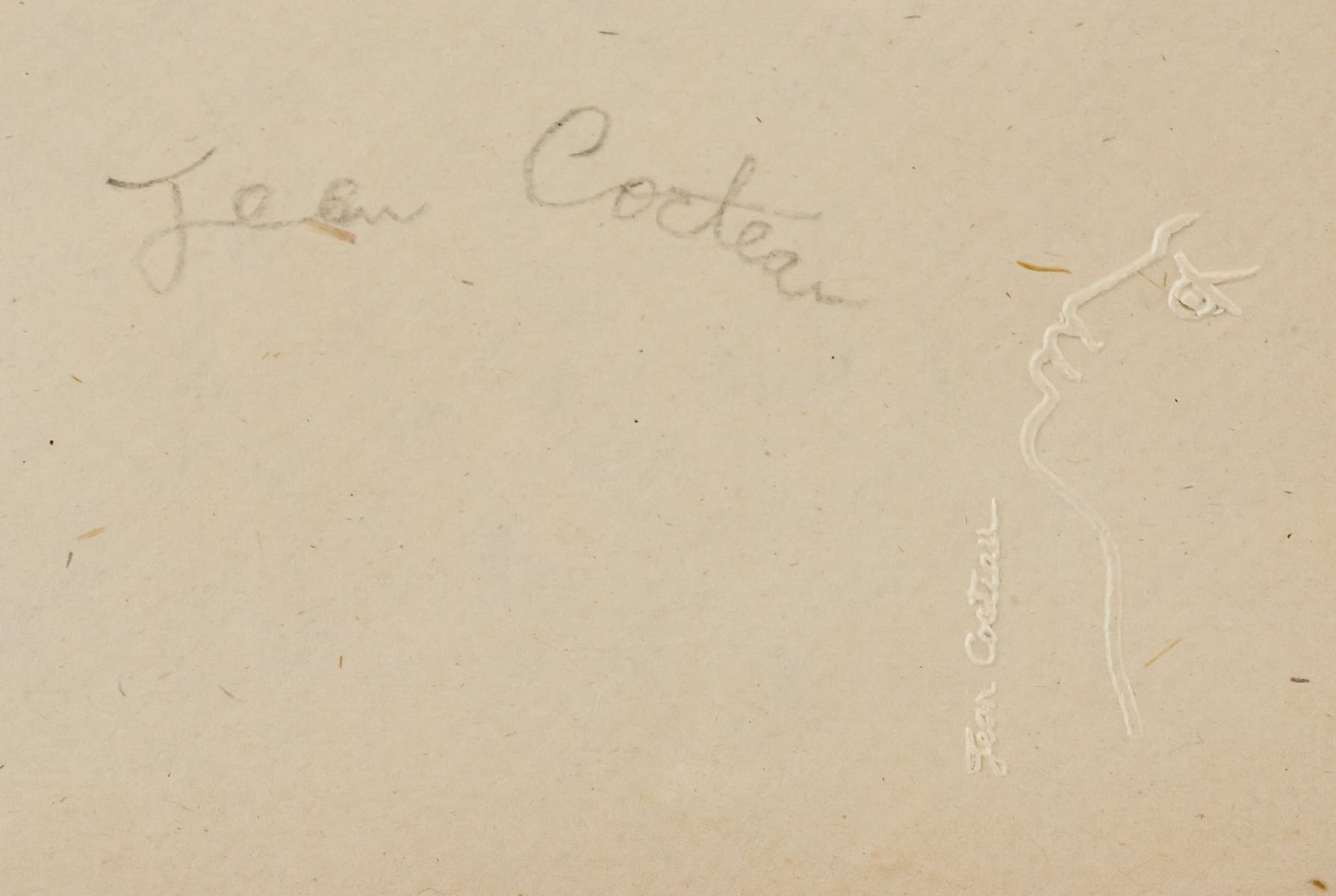 Graphite on paper. Featuring two portrait silhouettes, study. Signed Jean Cocteau on the lower right corner. Embossed stamp of portrait on the lower right corner. Attributed to Jean Cocteau (1889-1963, French). 27.5 x 23 cm (10.5 x 9 inches). Provenance: This lot carries limited provenance from a Private French collection