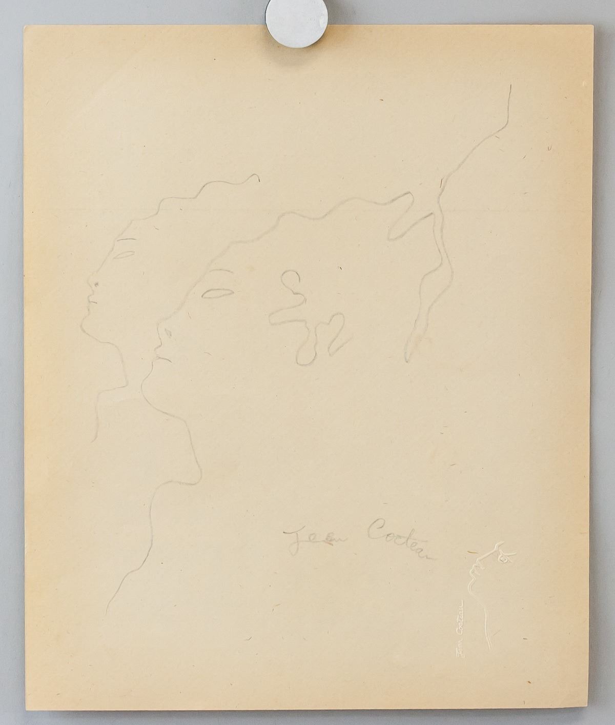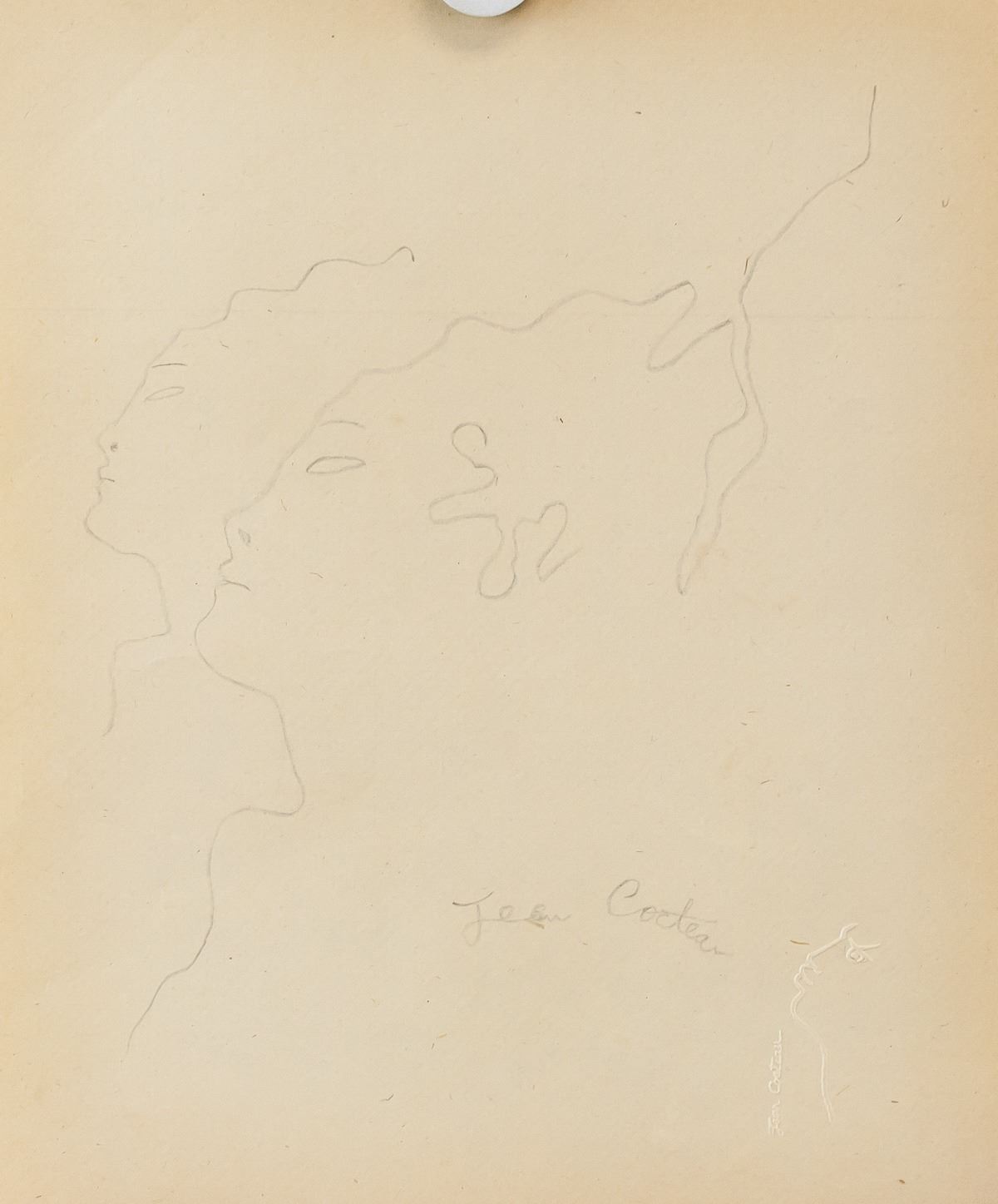 Graphite on paper. Featuring two portrait silhouettes, study. Signed Jean Cocteau on the lower right corner. Embossed stamp of portrait on the lower right corner. Attributed to Jean Cocteau (1889-1963, French). 27.5 x 23 cm (10.5 x 9 inches). Provenance: This lot carries limited provenance from a Private French collection