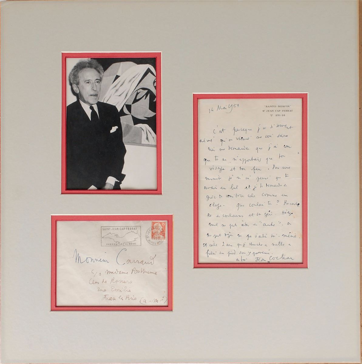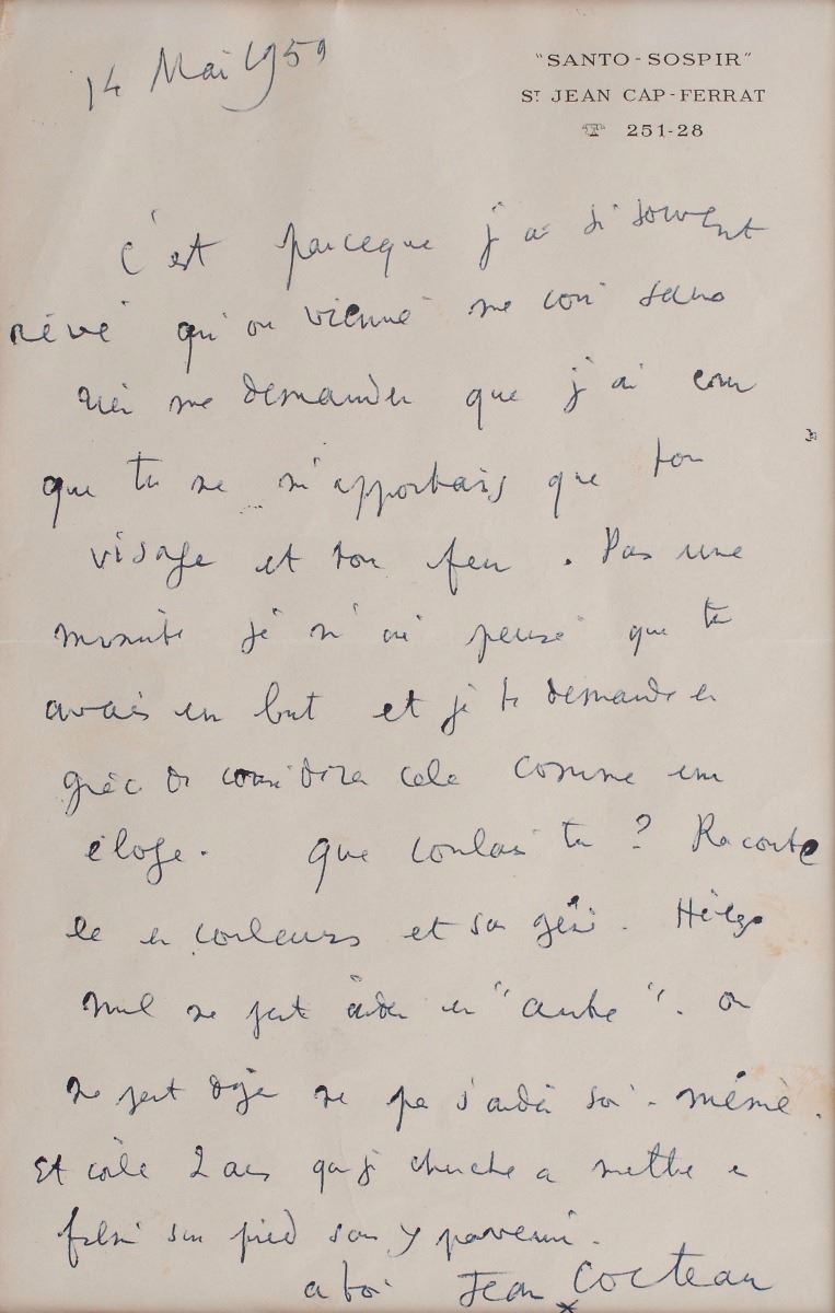 ALS in French, one page, 5 x 8, Santo-Sospir letterhead, May 14, 1959. Letter to Monsieur Carrand. In full (translated): "It is because I have so often dreamed that people would come to see me without asking anything of me that I believed you were bringing me only your face and your vivacity. Not for one minute did I think you had an objective and I ask you to consider this as praise. What were you relating? Tell it colorfully and freely—Alas—no one can help another once one cannot even help himself. For 2 years I am trying to get this film ready without succeeding.” Double-matted with the original mailing envelope (addressed in his own hand) and a photo to an overall size of 17.5 x 17.5. In fine condition, with a somewhat musty odor.
