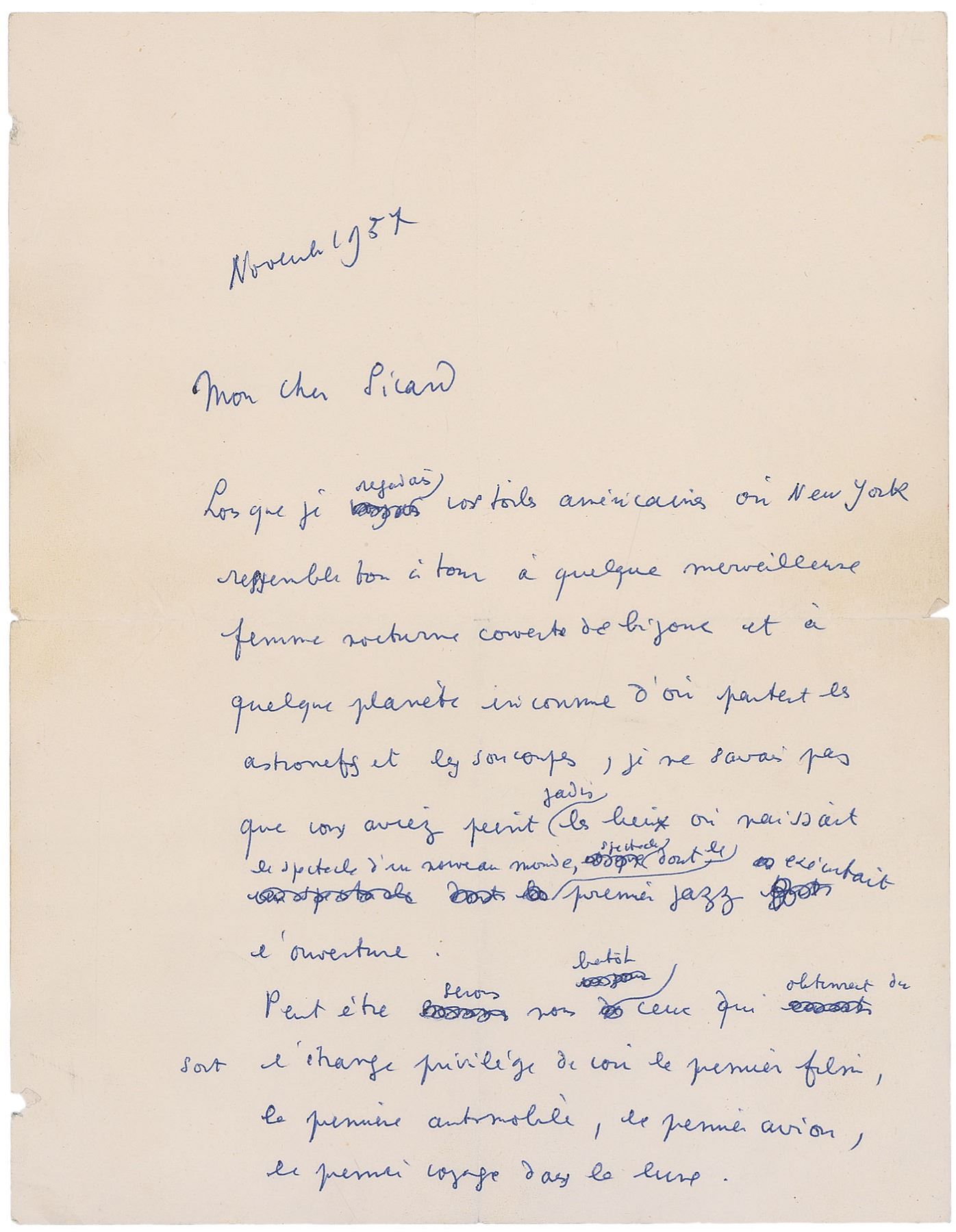 Versatile French writer and artist (1889–1963) whose spectrum of work included novels, poems, plays, illustrations, films, and set designs. ALS in French, signed "Jean Cocteau, member of the U. S. A. Institute of Arts and Letters," two pages, 8.25 x 10.5, November 1957. Letter to fellow artist Pierre Sicard. In full (translated): "When I was looking at your American paintings where New York in turn looks like some stunning night woman covered with jewels and like some unknown planet that spacecraft and flying saucers fly from, I did not know that long ago you had painted the places where the spectacle of which the first jazz played the overture. Perhaps we shall be soon the ones who received from fate the strange privilege of seeing the first film, the first automobile, the first airplane, the first voyage to the moon. And you will have been a witness and the historiographer of our somewhat frightening times which will make people smile someday as a kind of 1900 and which, with the passing of time, will appear full of charm. Should you find it amusing to cite the sentences in Cartes Blanches where I saluted the appearances of the black rhythms that currently possess their academy in France, I give you authorization. I could not have guessed then that the anti-academicism of this music would have its own academy and would ask me to be its president." Central vertical and horizontal folds with small separations at edges, and a few tiny edges tears, otherwise fine condition. Sicard was a French painter in the postimpressionist style, favoring wild and romantic nightlife scenes inspired by the Parisian bars and nightclubs he frequented. He traveled to New York in the 1930s, where he held an exhibition at the Marie Sterner Gallery in 1936; later that year he exhibited his new scenes of New York at Galerie Bignou in Paris. Sicard settled in the US in the 1950s, traveling between New York and Los Angeles, where he continued to create exuberant scenes of the vibrant cities. A wonderful letter in style and content by Cocteau, in which he also mentions his own Carte Blanche, a 1920 critical text in which Cocteau credited jazz with the salvation of modern French music.