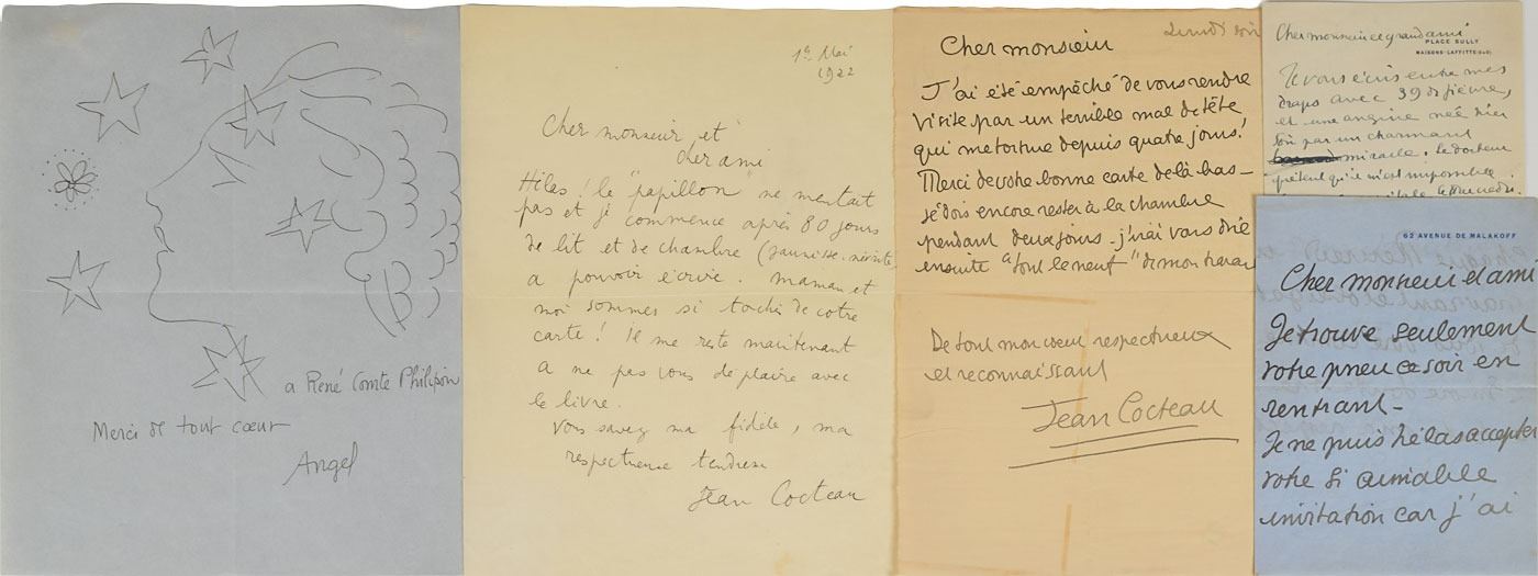 Small archive comprising four ALSs in French and one original sketch, totaling seven pages, most undated. In a letter to Rene Philipon, he writes, in part (translated): "Vallette publishes my next volume…I'm afraid that Vallette…does not faint from my book and especially from a new humorous suite on Versailles that you will like!" A sampling of quotes from the other letters (translated): "I unfortunately cannot accept your kind invitation because I have every Wednesday a family dinner, heartbreaking and obligatory—It is useless to tell you how I regret!"; "I start after 80 days of bed and room (jaundice)…to write. Mom and I are so affected by your card! I now have to please you with my book"; "I will then tell you all the news of my work." The ink sketch is inscribed below, "A Rene Comte Philipon, Merci de tout coeur, Angel." In fine condition.